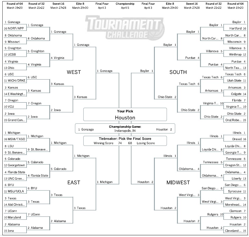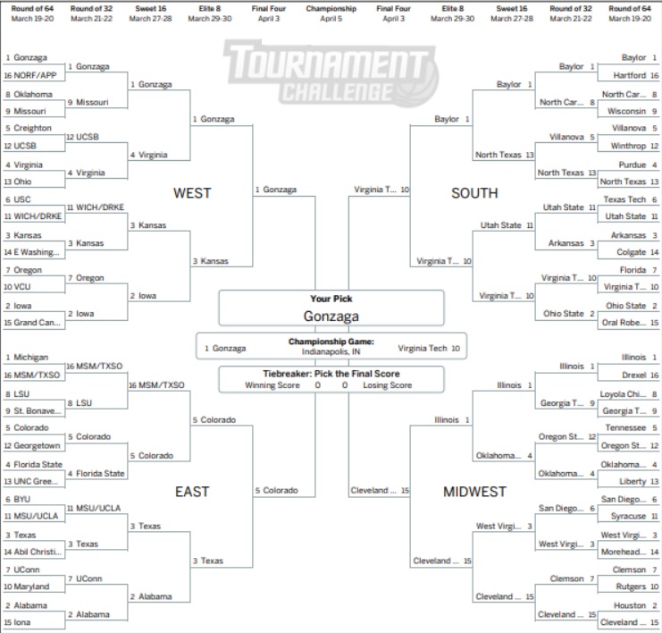 Games picked right in the first round will earn 1 point each, 2nd round 2 points, 3rd round 4 points 4th round 8 points, Final four 16 points and 32 for the correct champion.