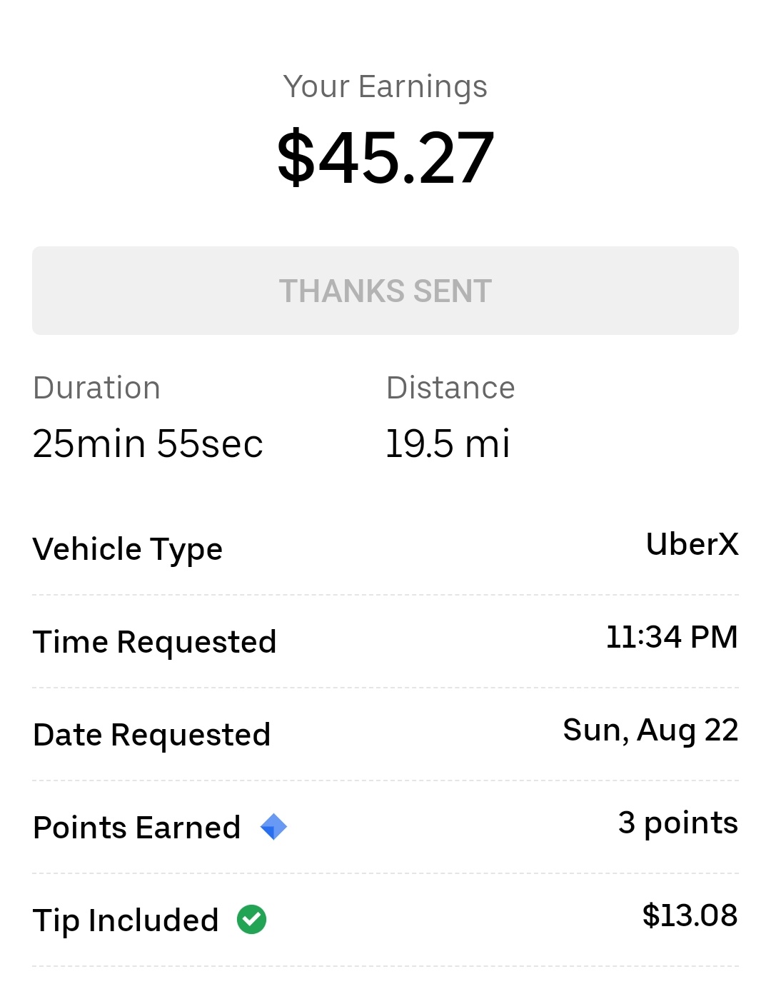 Finally decided to work to make up for debts. Hit the jackpot last night, rider tipped me $13. Made $45 in 25 minutes.