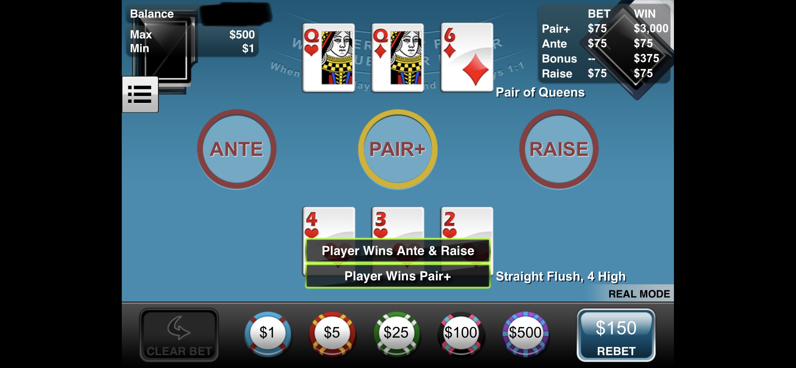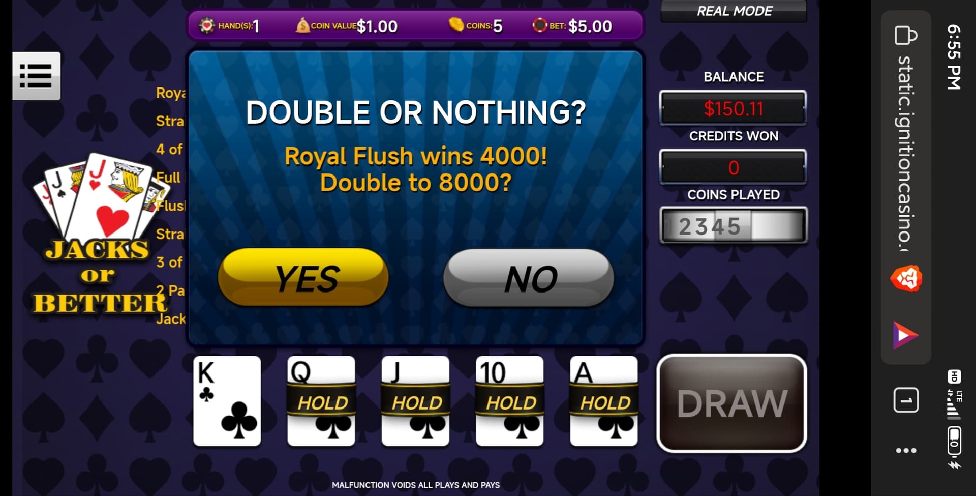After winning all the major jackpot in practice mode for reels and wheels xl I won it on 3x for 10k each I decided to try real mode… Got dozen of wheel bonus for 6x,8x,10x wins only… Got upset and went to ignition to test my luck 3 hands in I got dealt a 4 to the royal… 10,Q,K,A of diamond so I kept those 4 and next card dealt was a J of hearts… My heart dropped so bad… Then what do you know 10 hands later got dealt 4 to the royal again… This time it was 10,J,Q,A of clubs… Kept them and it paid off