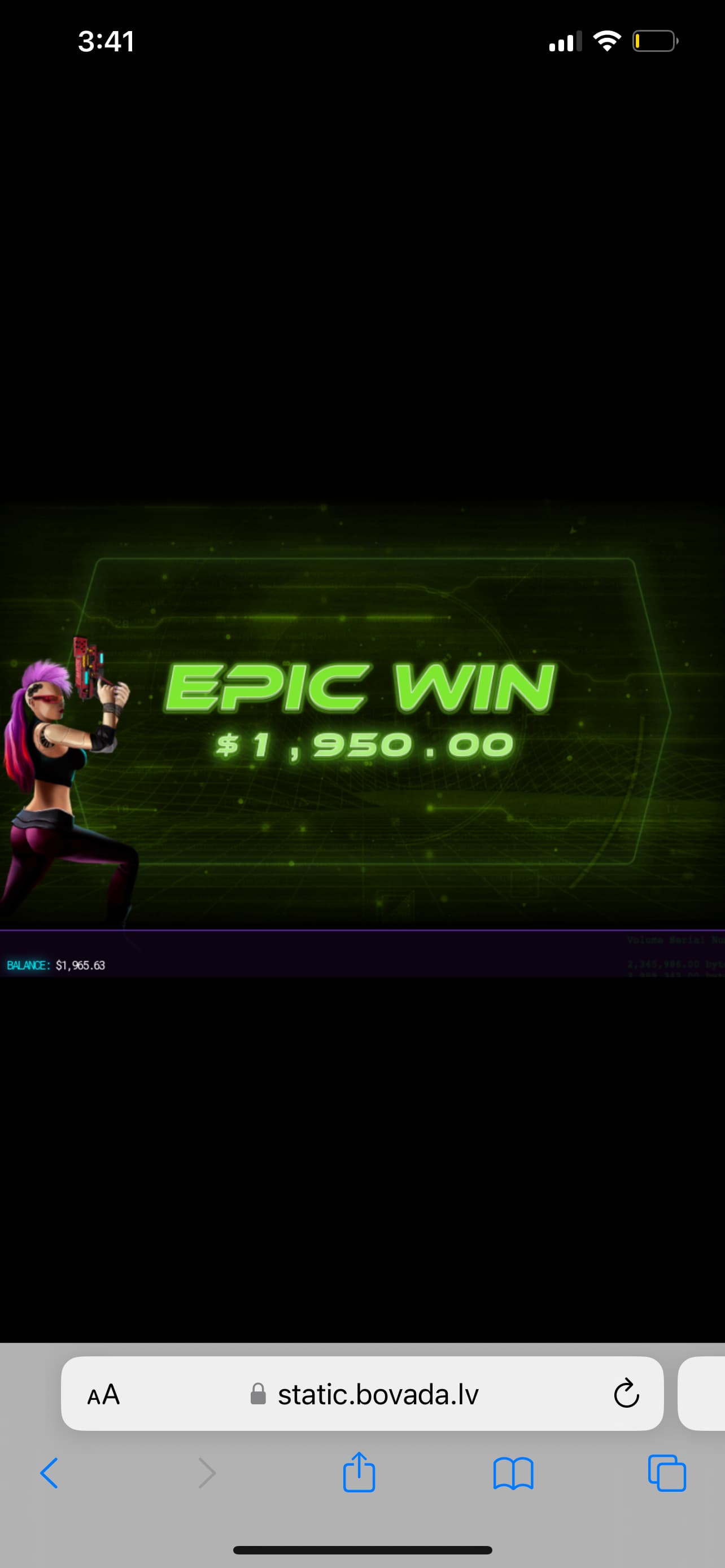 Oh I’m sorry I misread the question I was betting 10 bucks a spin, I had won another 1k previous to that 1900 but I didn’t screenshot it. It was the first time ever winning big on cyber city punk I don’t usually win anything on there