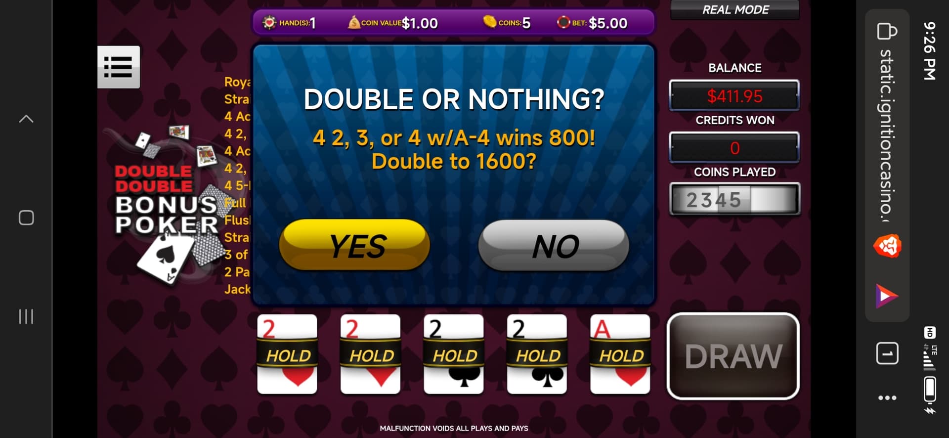 Nice wins… Yeah finally after about a month of straight taking it the a** I finally did good… Hit 4 twos with kicker on double double bonus poker… First hand had 3 twos and pulled the last two with a four… 2nd hand didn’t have to do anything just collect lol