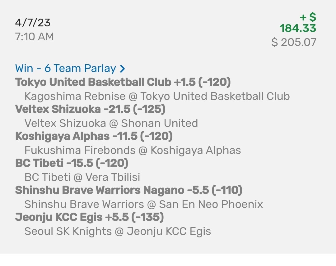 I couldn’t hit the side of a barn yesterday. But i consulted E. HONDA, a legend on street fighter and he gave me this 6 leg parlay of Japanese basketball