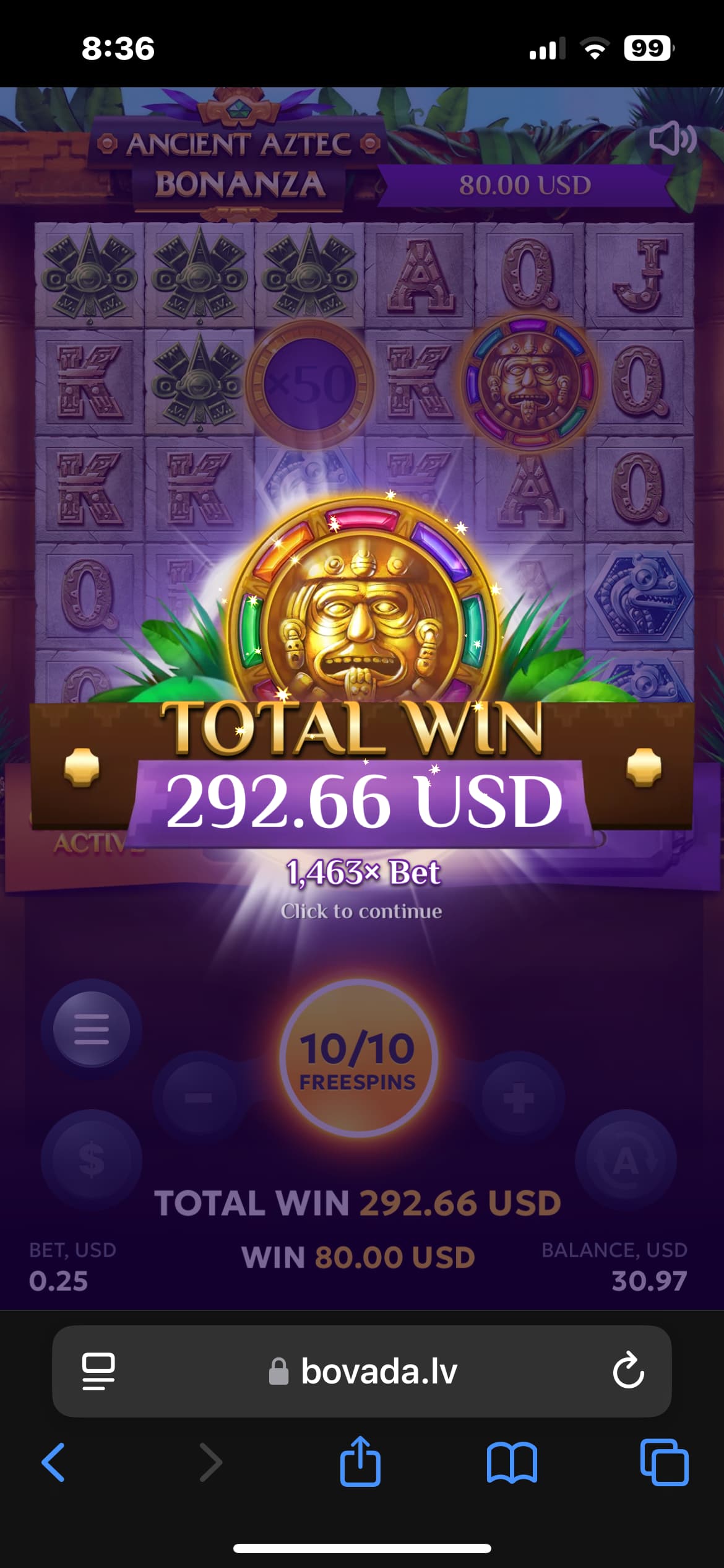 I made it to the bonus round on that ancient aztec today. $3.75 a spin. Would you believe all 10 bonus spins were losers! Paid the $9 just for the 4 scatters. Cost me $136.25 just to get to the bonus round.