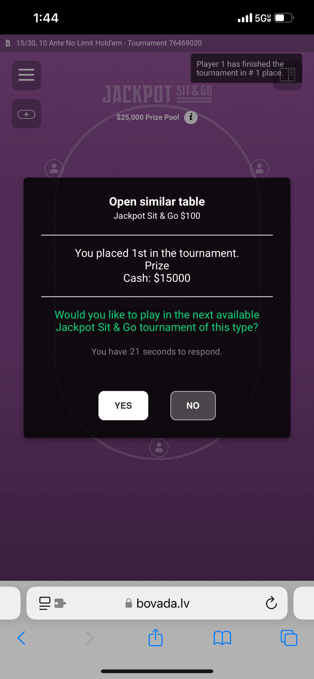 So I buy in and open a new tab as I wait for people to buy in when i went back to the sit n go page I was in shock to see a 25k pot. Got lucky with trips on an all in.
