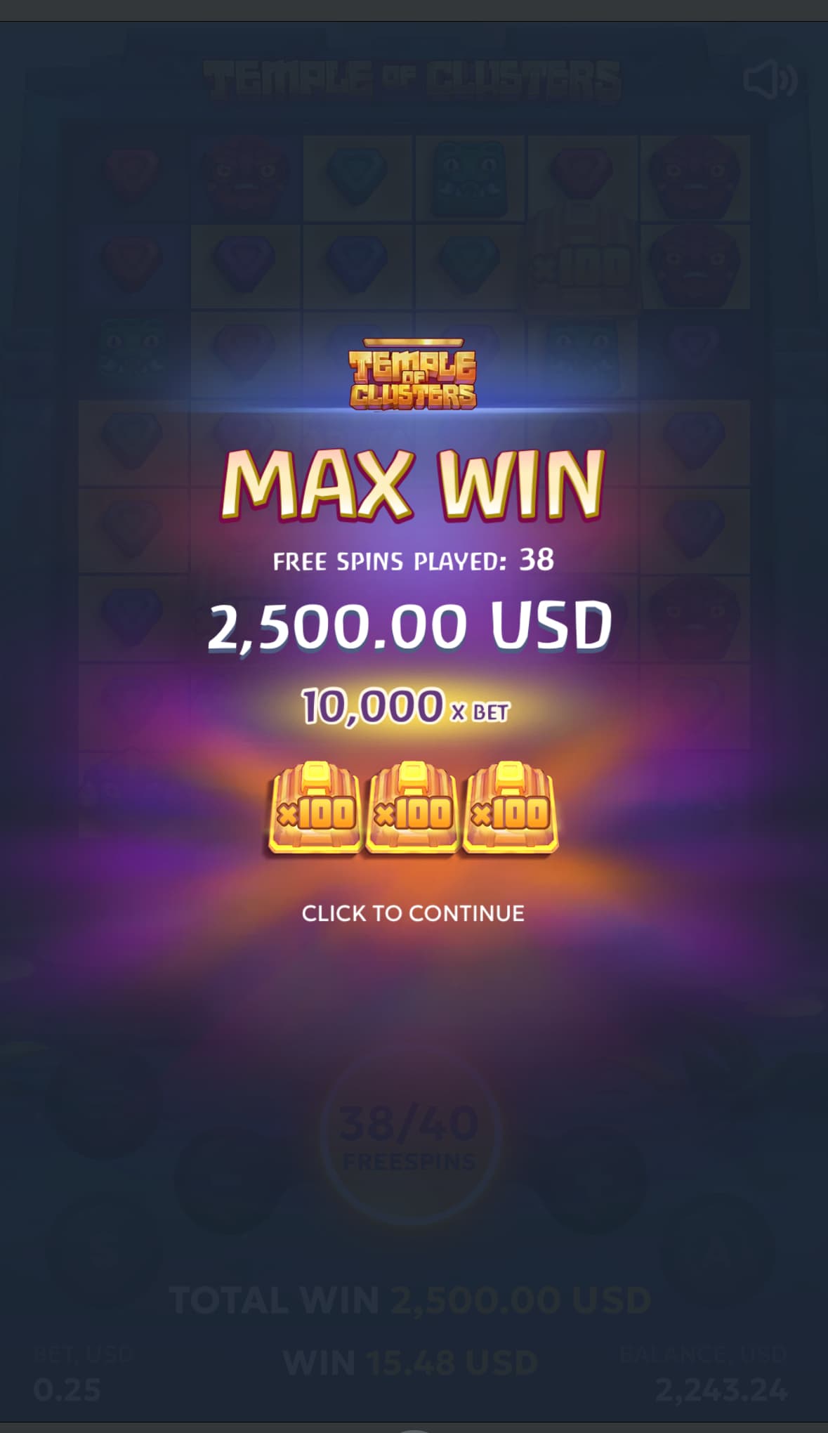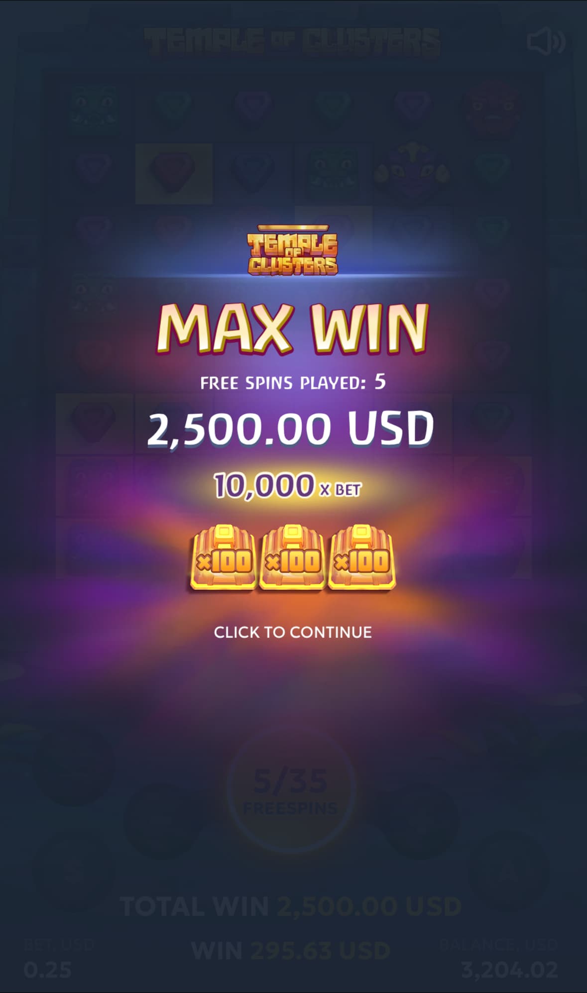 Finally got a max win. This was on Temple of Clusters. Had 3 retriggers.