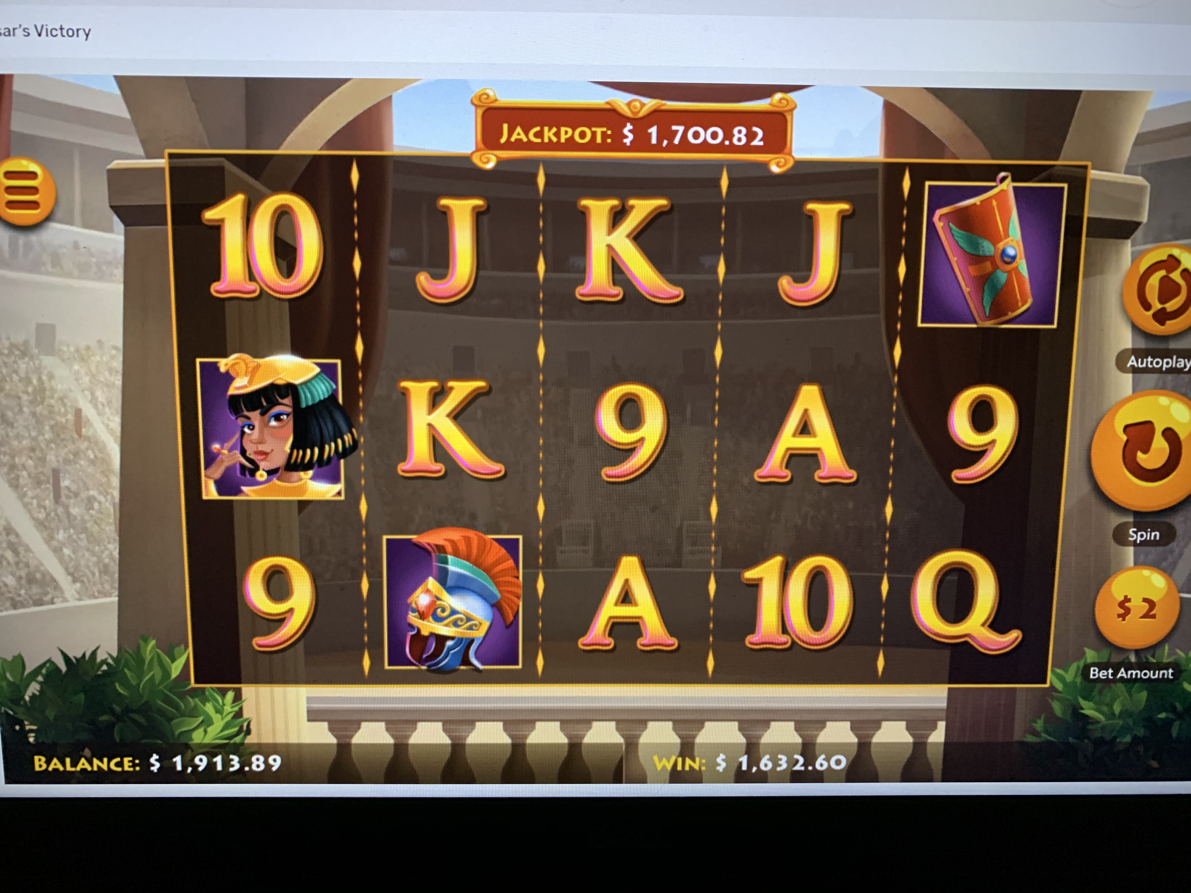 $2 bet on Cesars, hit almost as much as the progressive. 3 Cleos and 2 Coins in the arrow pattern during bonus.