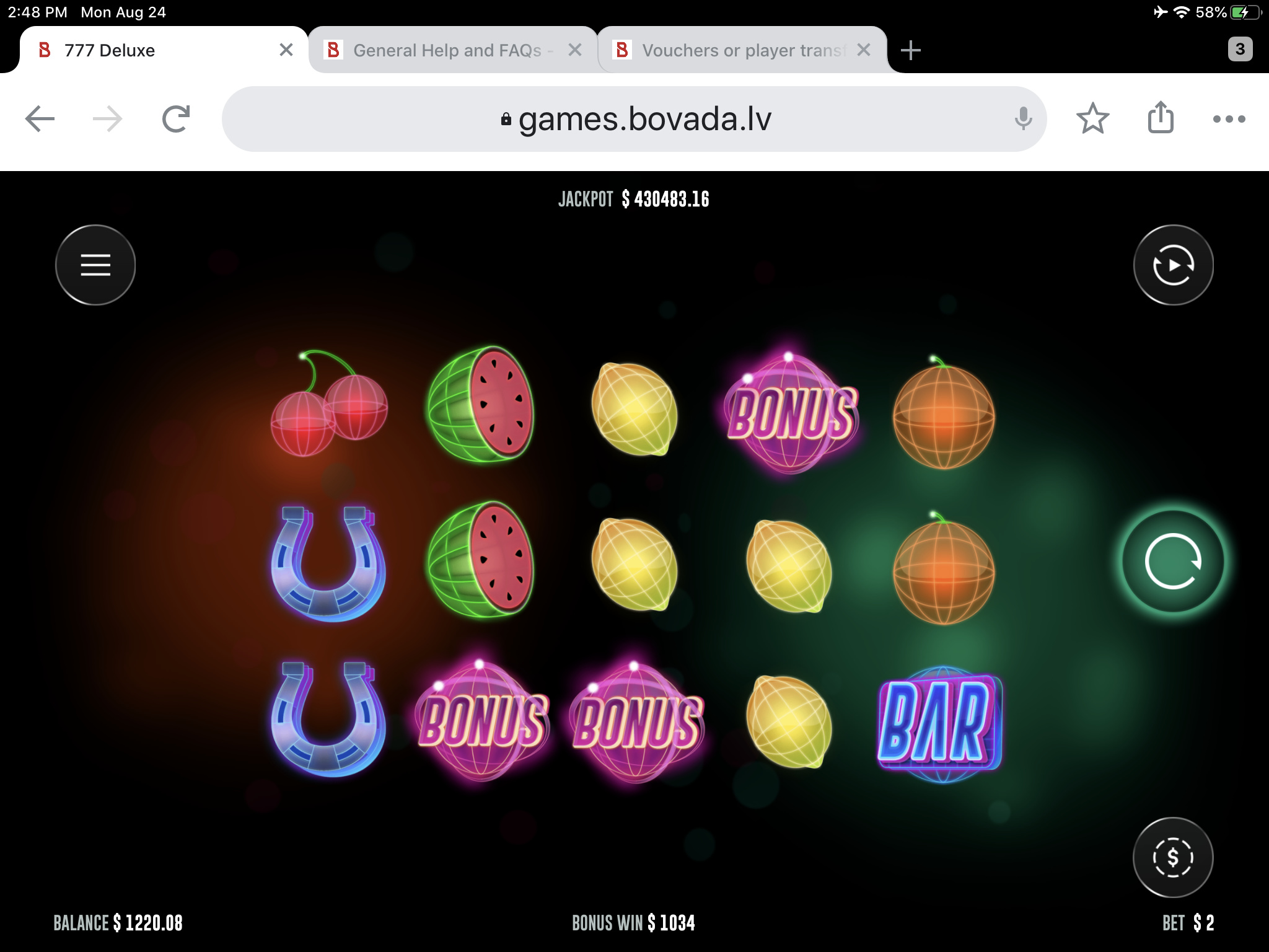 I only play 777 when the jackpot gets over 250k. I don’t know why anybody would! I have never hit anything on this game till today. A 517x winner on $2 bet. I figured it must be a sign…it wasn’t. I played the whole winnings at $1, $2 & $4 bets and hit 3 more bonuses and none paid more than 30x. Too variable for me to play regularly.