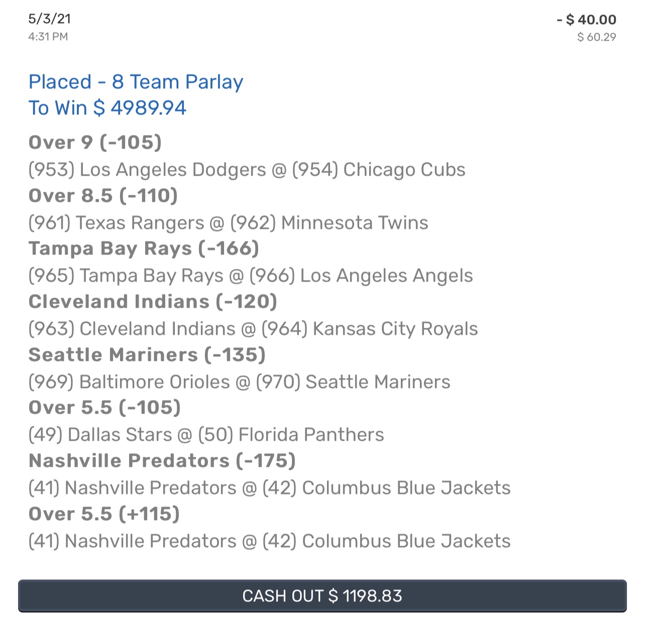 One of the worst way to lose. Seattle winning the entire game gives up 5runs in the 8inning and lose the game 5-3 last night. Could of won 5k off 40$ smh