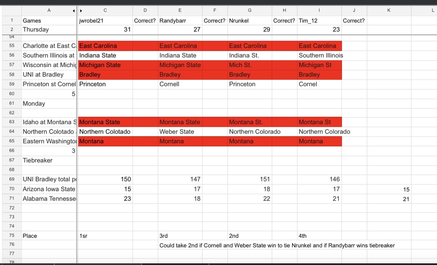 @randybarr got the win with Cornell and winning a tiebreaker for closer on UNI game O/U.