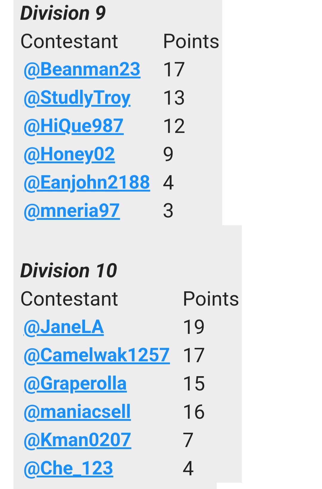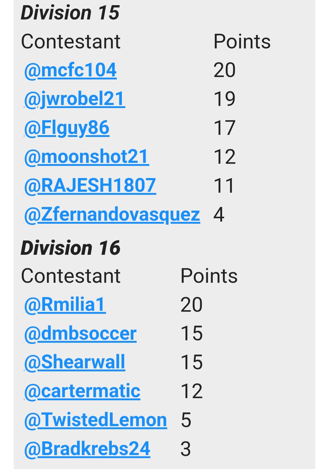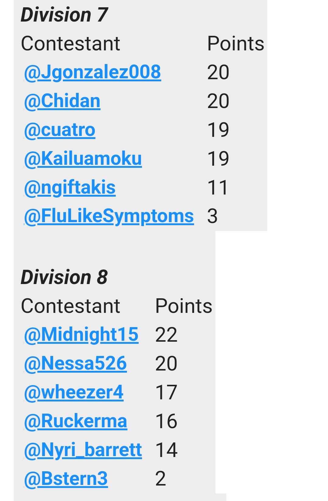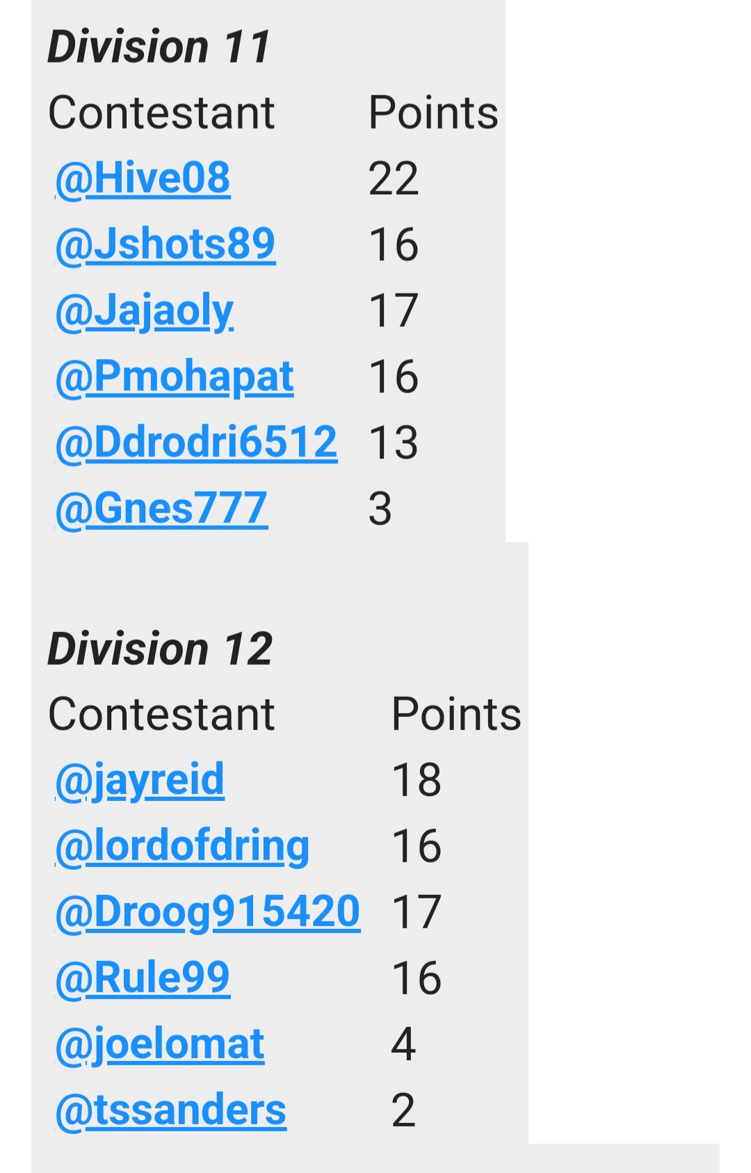 | Contestant | Points |