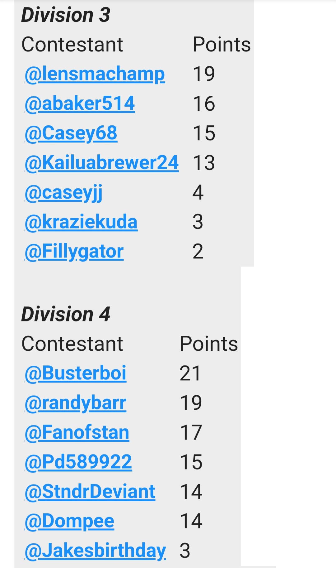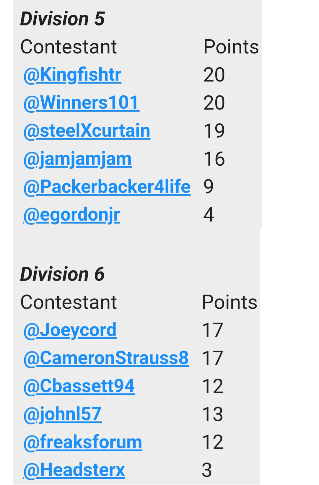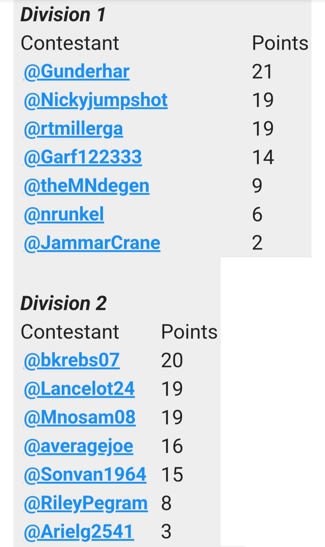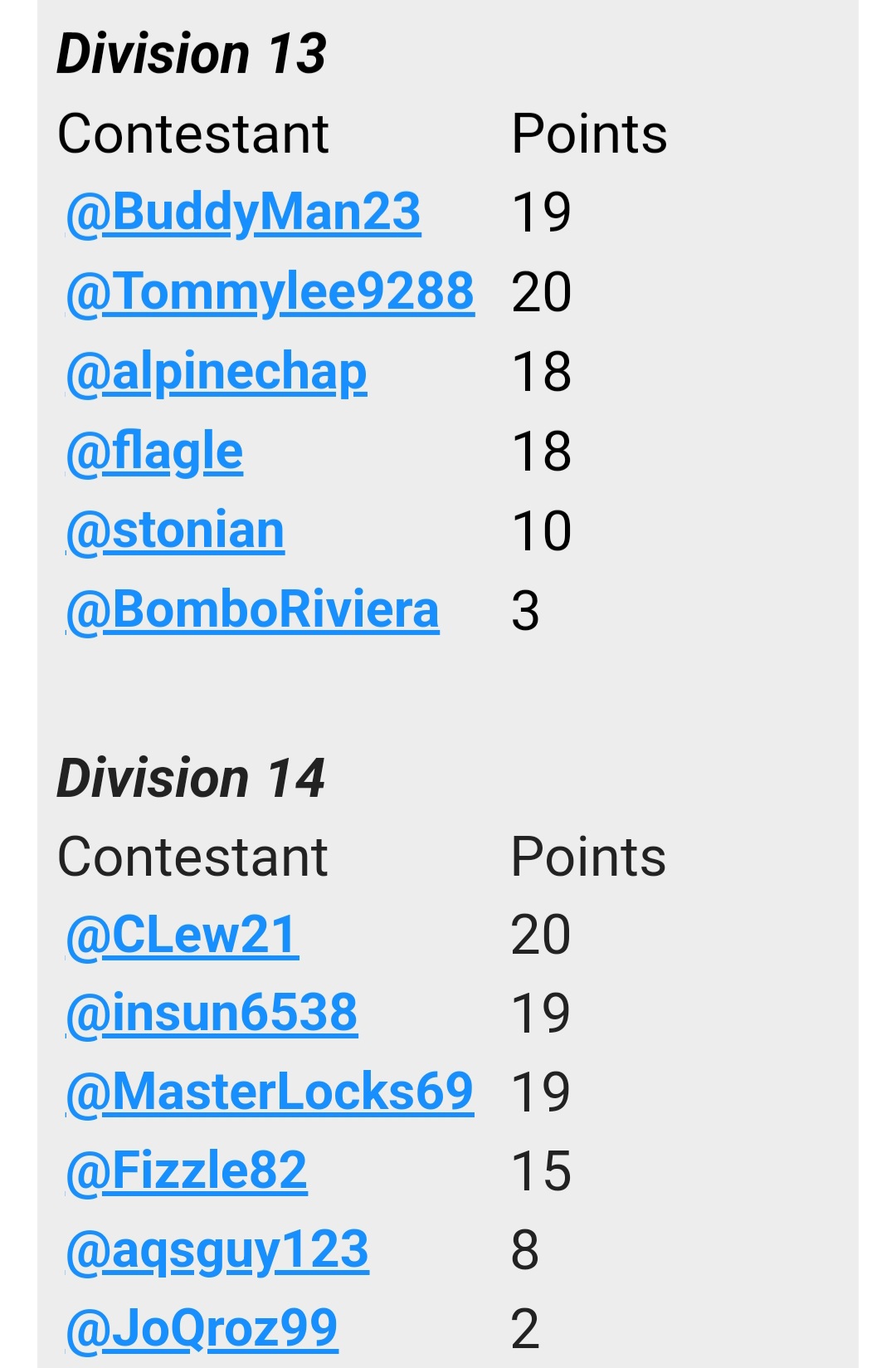 | Contestant | Points |