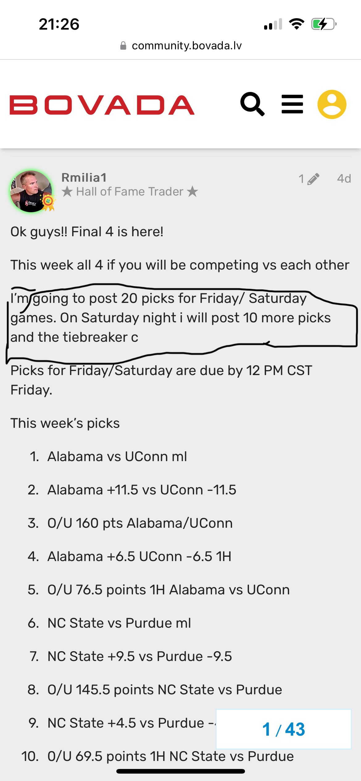 Hey everybody. @Rmilia1 @Duckfan32 @Rmilia1 @jayreid @Jajaoly Just starting my Bovada day. Give me a few minutes and I’ll have everyone’s picks posted.
