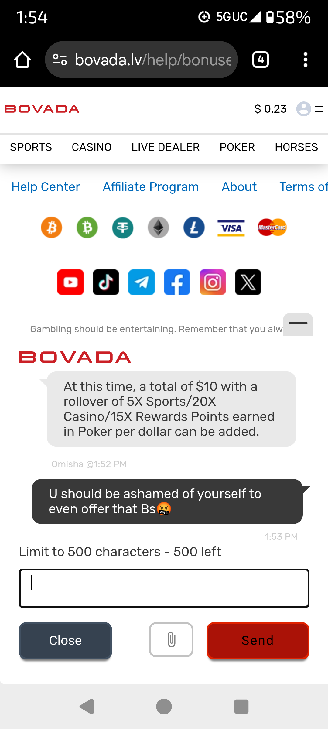 They sent me a message saying your crypto is in your account which was a dang lie cs gave me 50bonus smh bovada is really gonna lose a valid productive customer why send a message and its not true