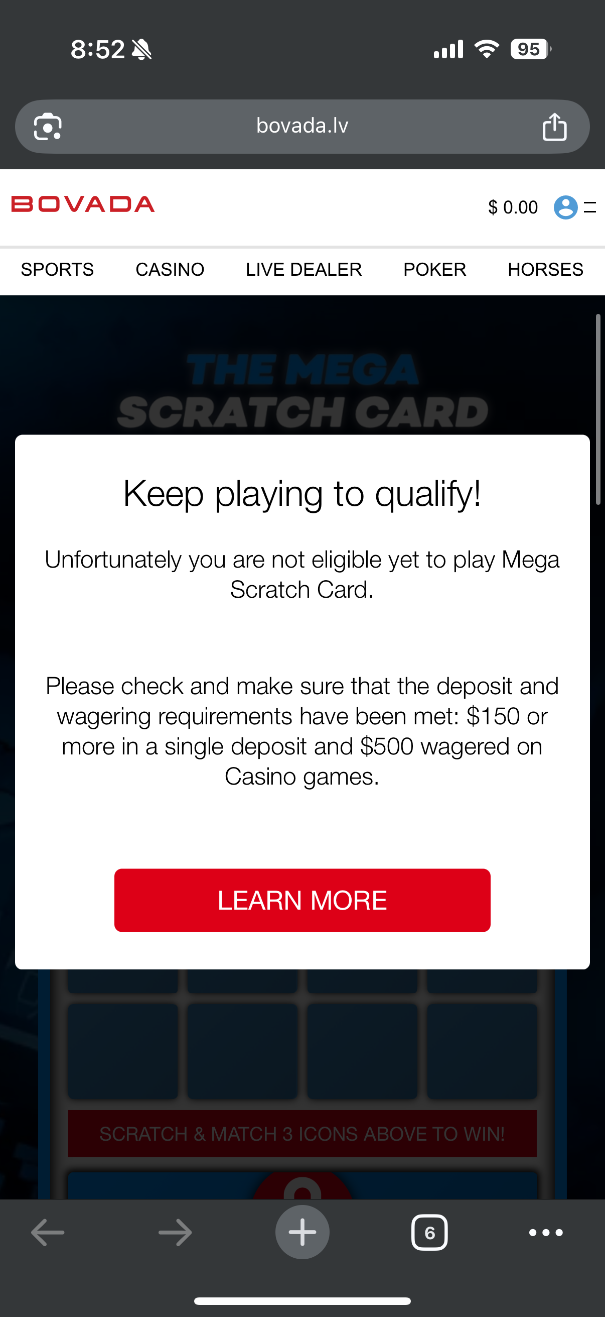 @moderators can you look at my account? I got notification about the 8 free scratches yesterday and I made a qualifying deposit on Sunday and have played well over the $500. Today when I refreshed the page for scratch card that I still had open it says I’m not eligible. I did spin and won’t be available until tomorrow but it doesn’t say to come back in X hours. It says ineligible.