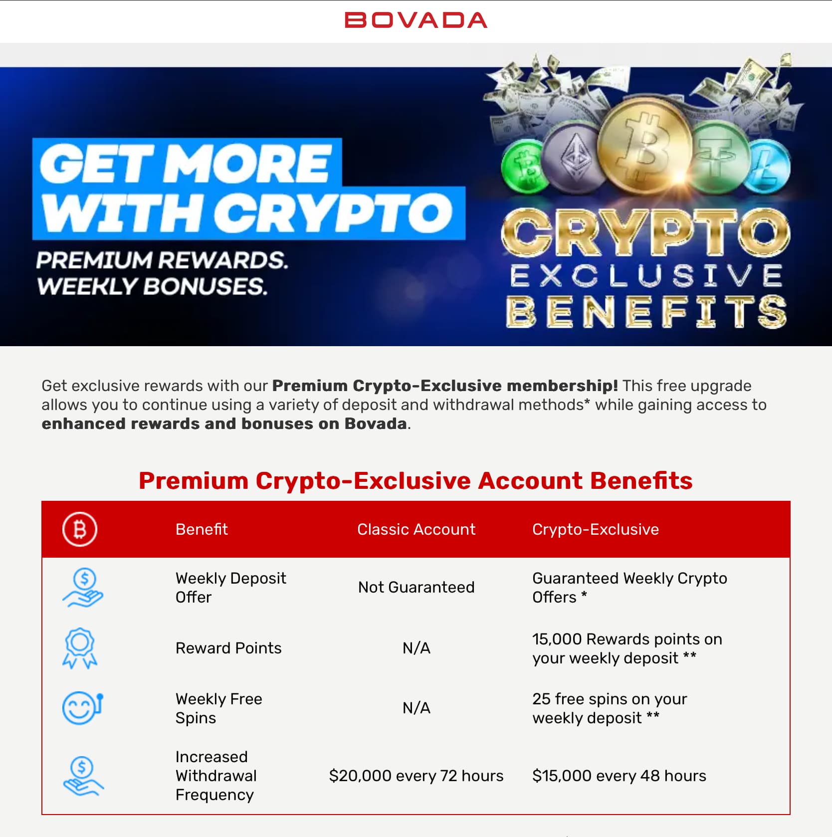 I donāt know if itās tied to tier status or crypto exclusive, but every week (starting on Monday) when I make a deposit, I get 15000 rewards points and 25 free spins. Usually they hit my account within 15 minutes of the deposit.