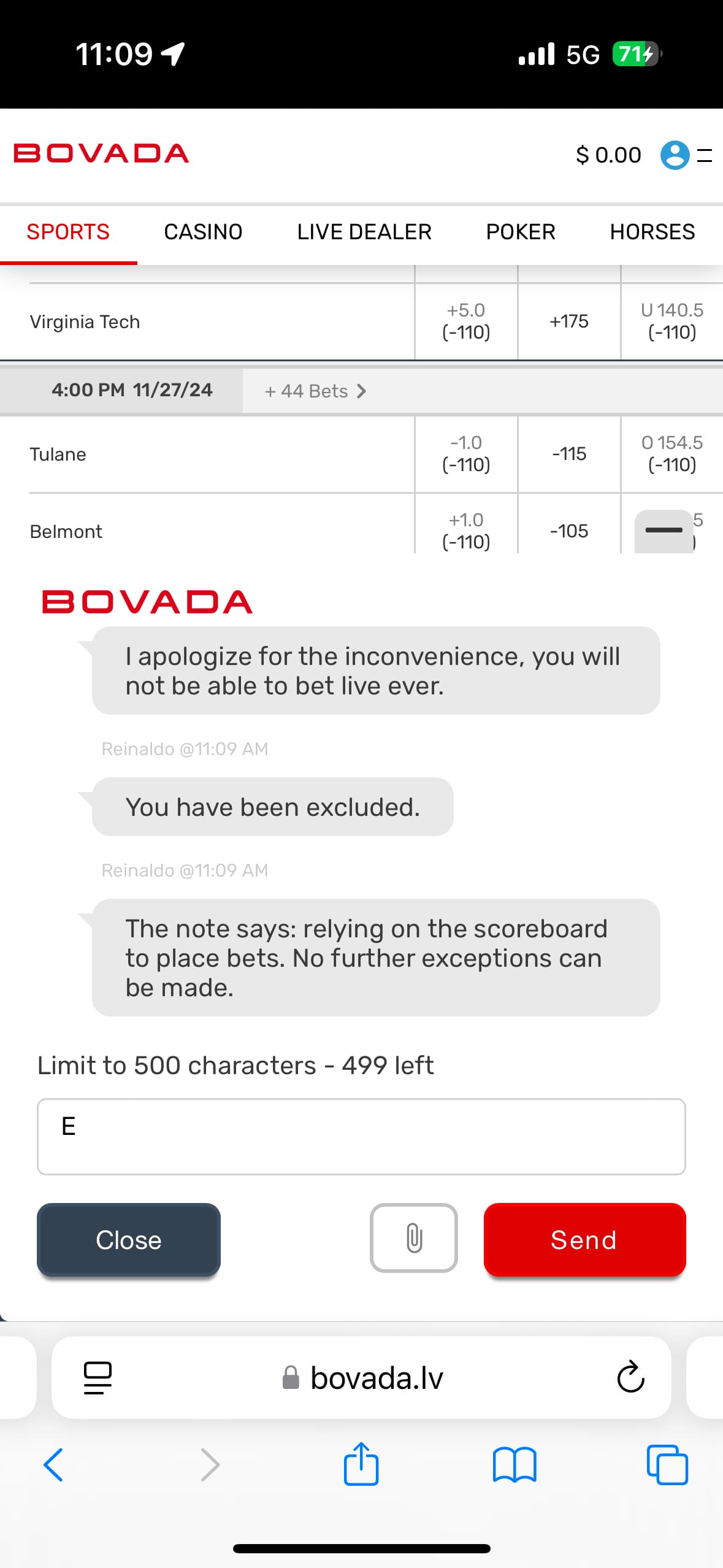 I’m out as well. Been depositing roughly $2 a day to ensure the same issue from last week doesn’t happen (compensating only “affected players” - players who wager on the day). I wasn’t considered “affected” because I didn’t wager even though I knew there were issues and didn’t want to deposit knowing there were issues. Thankfully the @moderators here were actually somewhat helpful on this one and really listened to me and my situation, but I don’t want it to happen again. But Bovada had lost my business. The site really has lost all sight of what’s important… their customers.