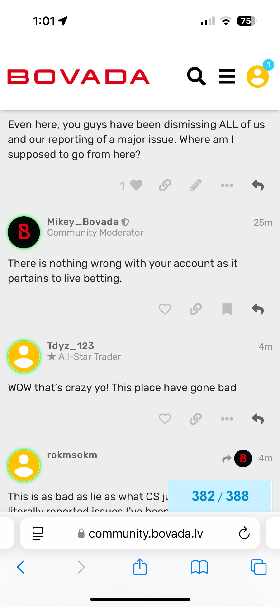 @Maddie there is very much something wrong with my account as it pertains to live betting. Being told otherwise is simply not true⦠donāt get me wrong⦠I like @Mikey a lot⦠heās helped me many times in the past when others havenāt. That being said, there is VERY MUCH SOMETHING WRONG WITH MY ACCOUNT AS IT PERTAINS TK LIVE BETTING!