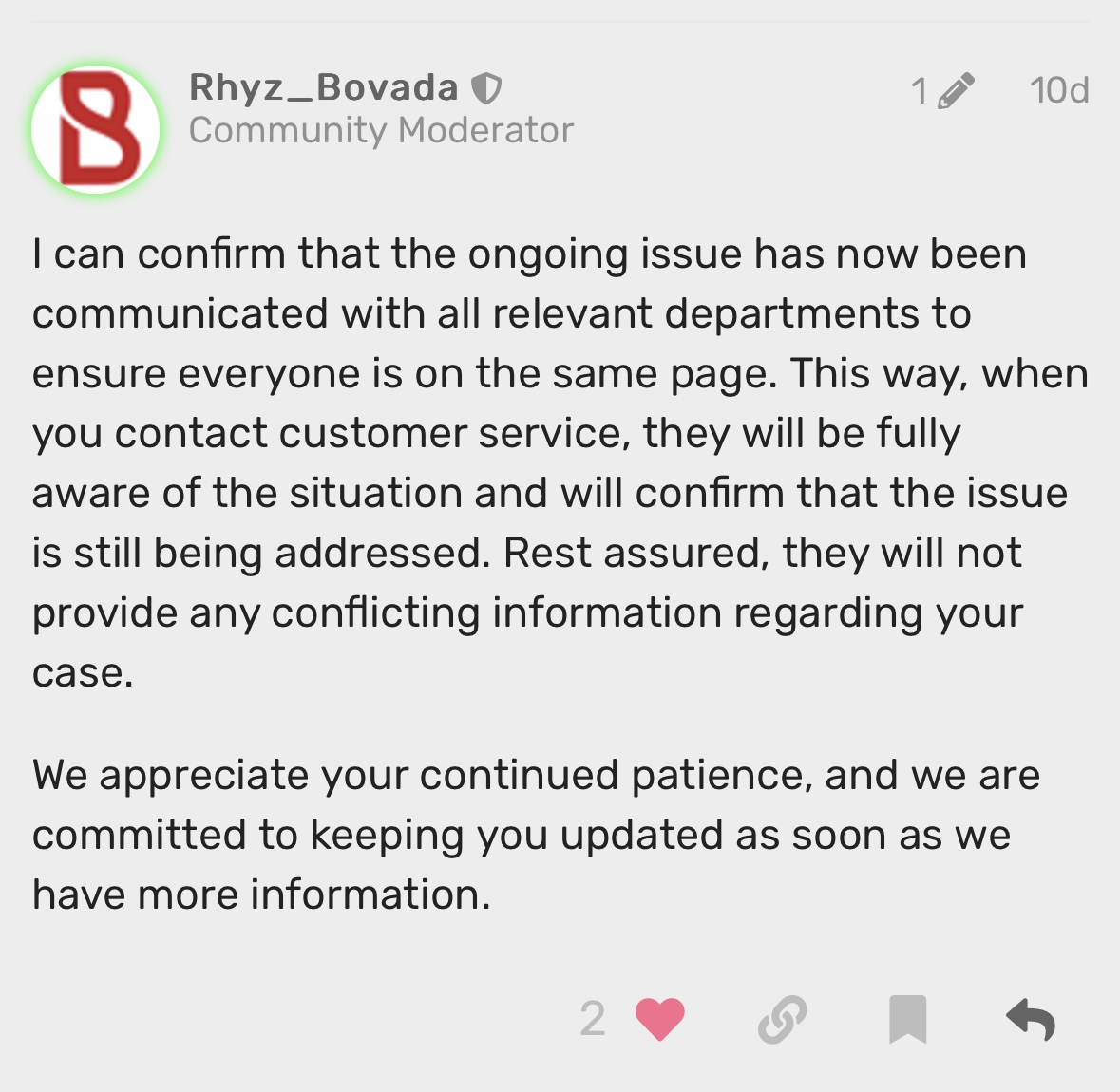 According to @Rhyz_Bovada 10 days ago, if I spoke to cs they should all be completely aware of the issue.