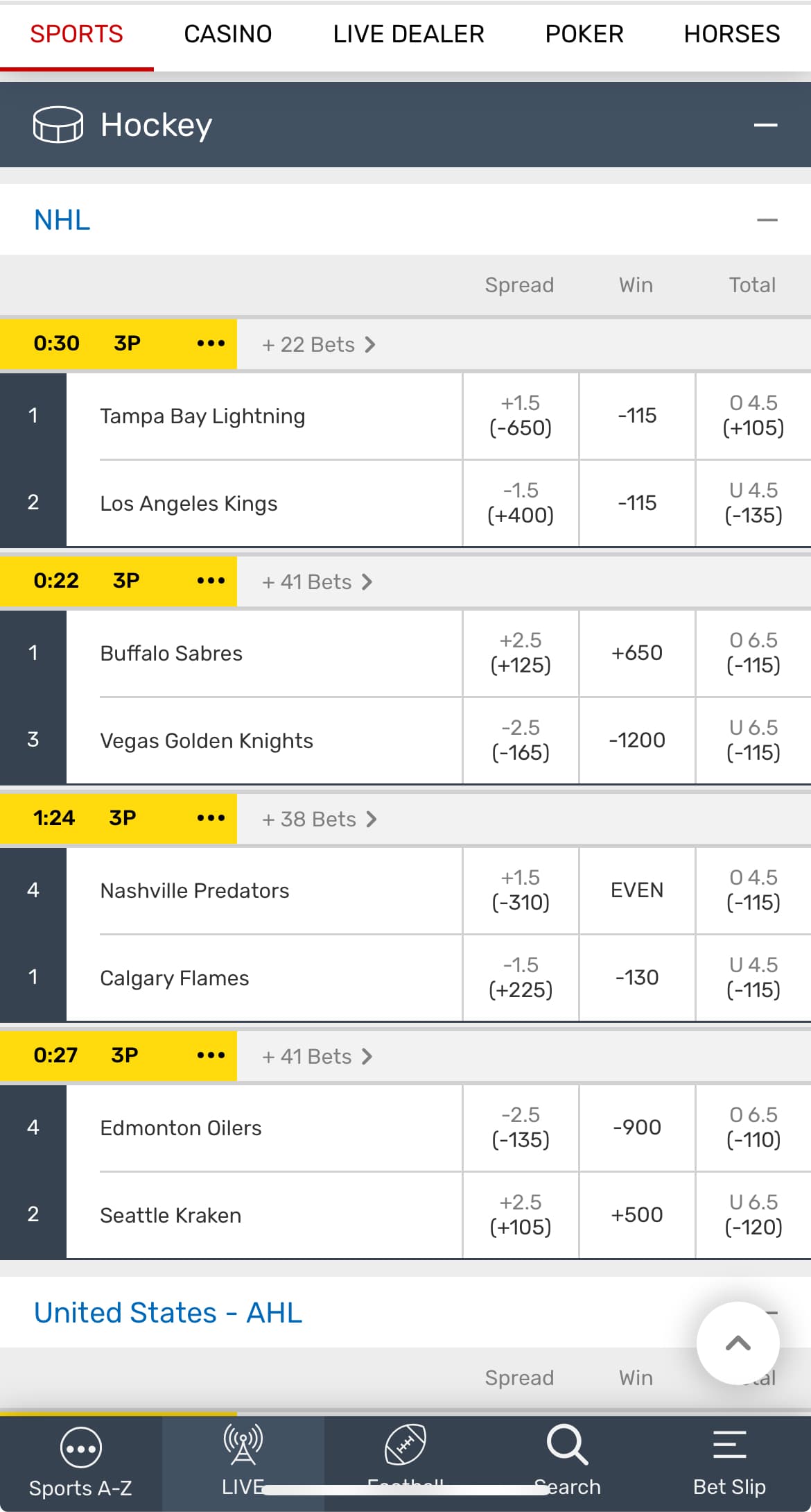 Hereās the āliveā tab again as of right now. Shows NHL games that ended yesterday with wrong scores, wrong time, and appear to be open bets I could place.
