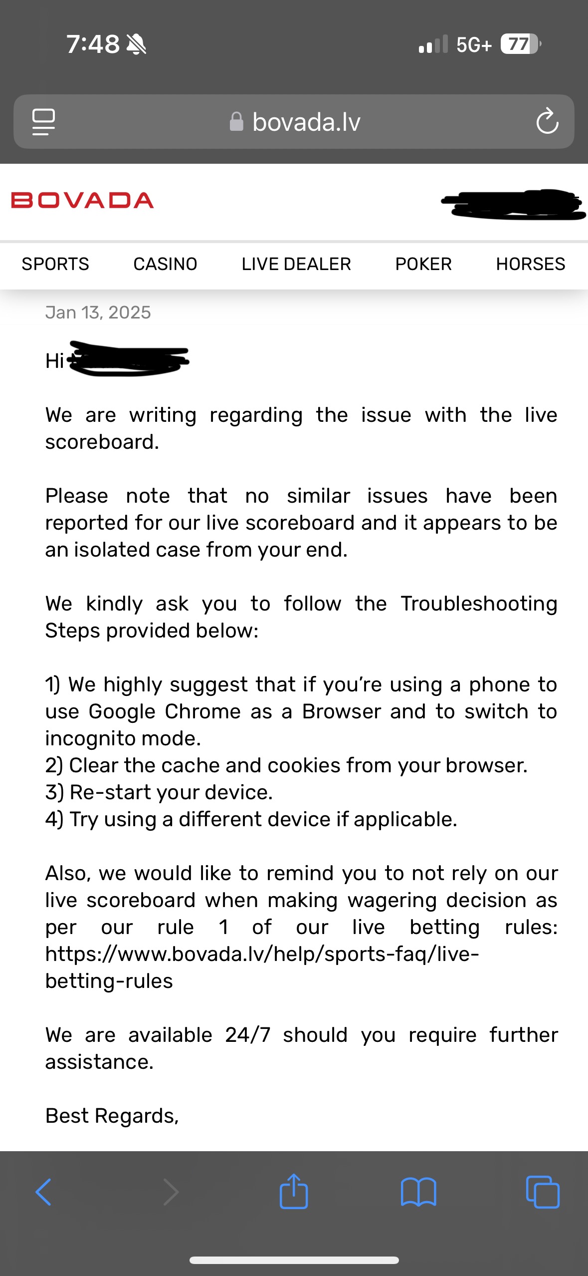 I tried explaining that I like to live wager primarily so this whole issue has completely derailed how I play because of how inconvenient the system is now. Zero compensation whatsoever for whatever reason. I have a VERY hard time believing that if the casino had an issue like this, Bovada would be treating the situation a lot differently.