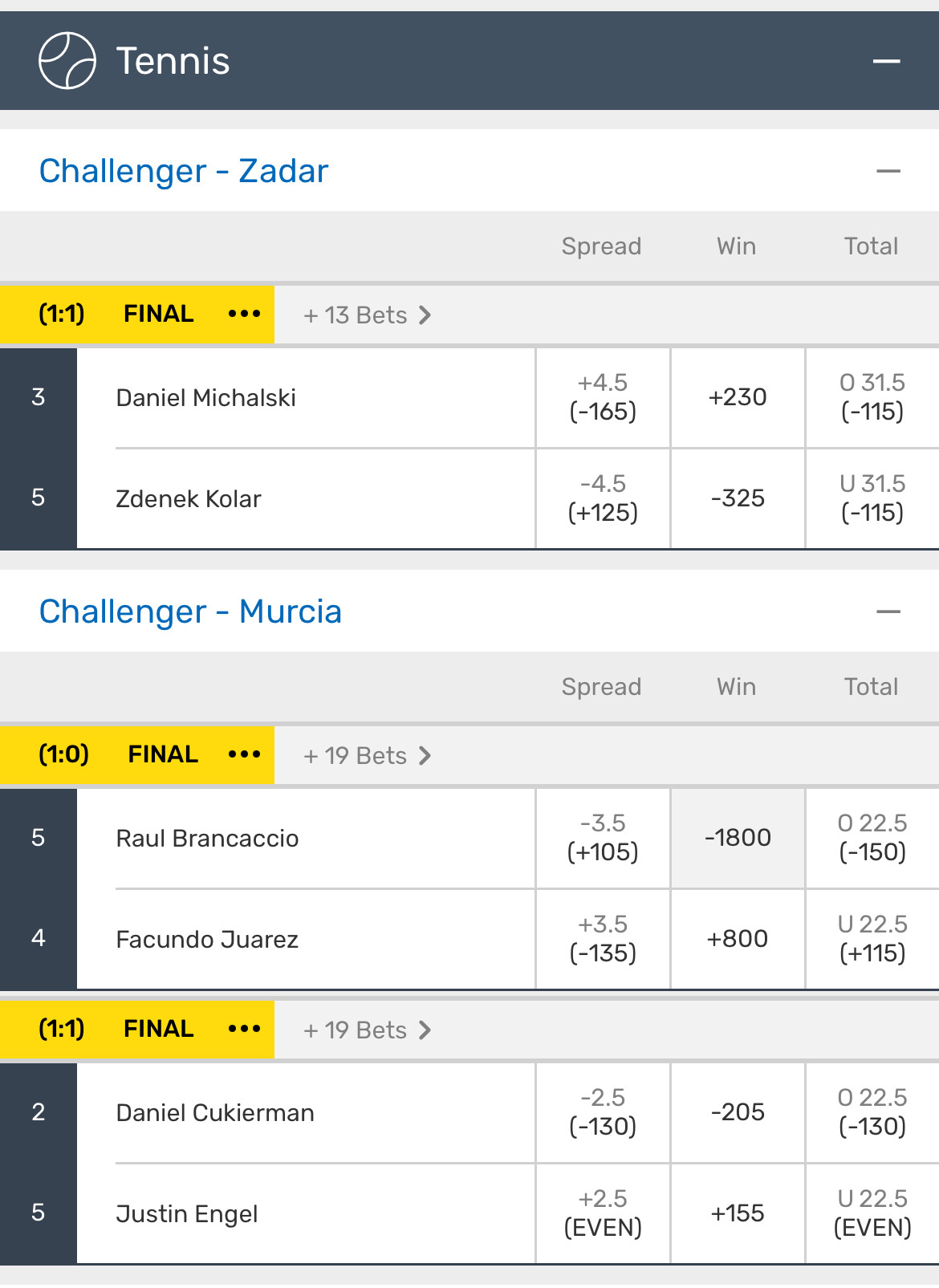 Currently the live tennis betting page is showing 10-15 matches, men and women, that finished TWO days (2) ago or more lol. These player have played different matches even, since the ones currently being displayed in “Tennis”