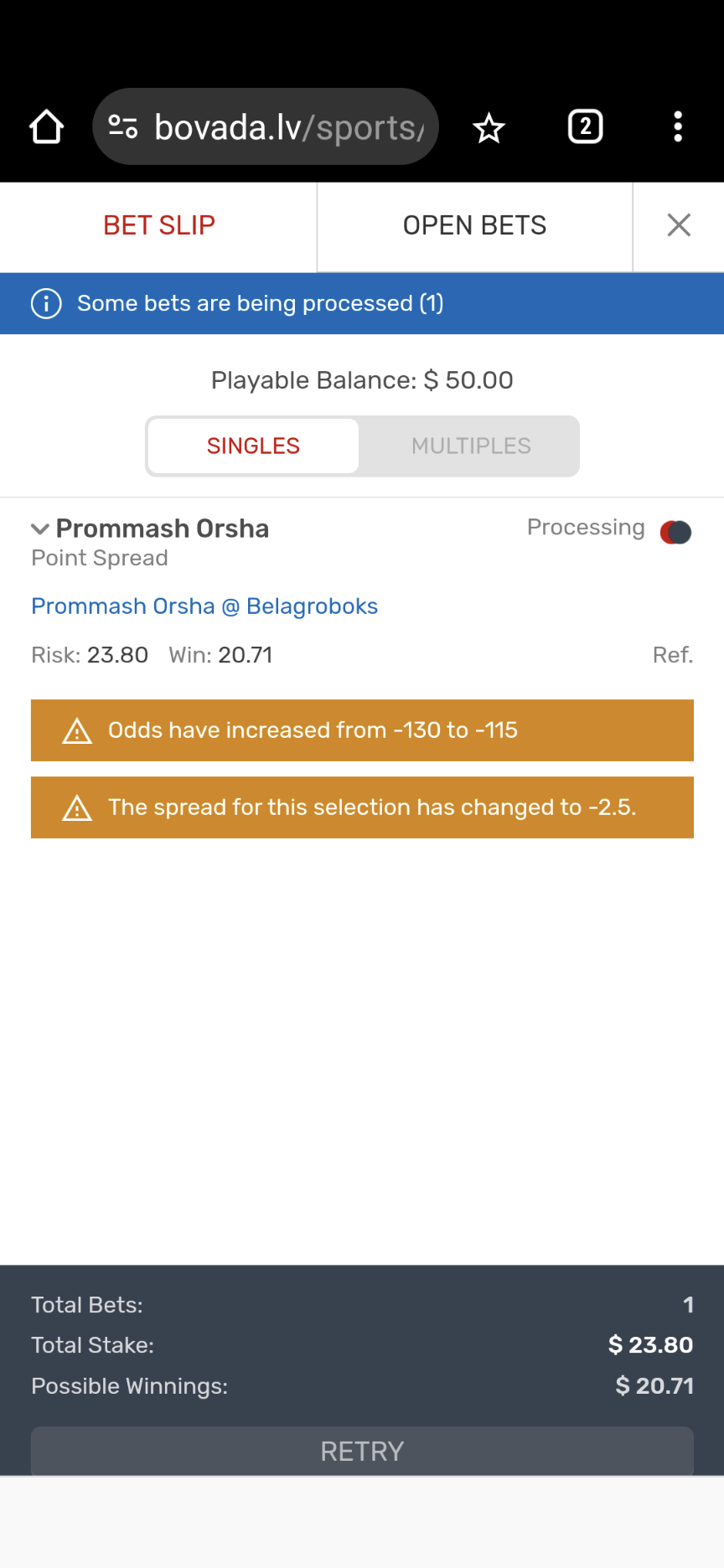 Yes. I have made sport bets and it just keeps processing and sometimes when it is accepted…the odds are not the same as when bet is placed. Bovada…you are better than this.