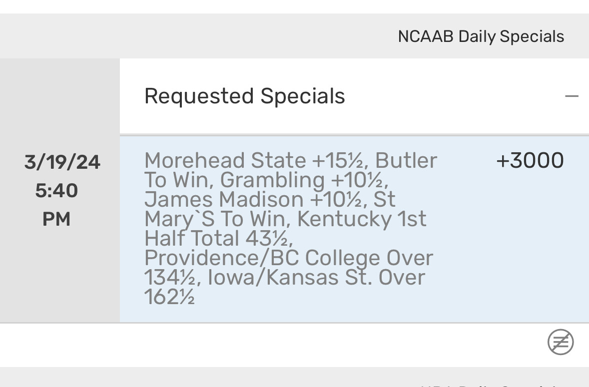Can I get the following 8 picks added as a parlay special for March Madness games please?