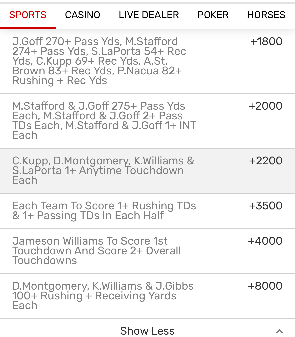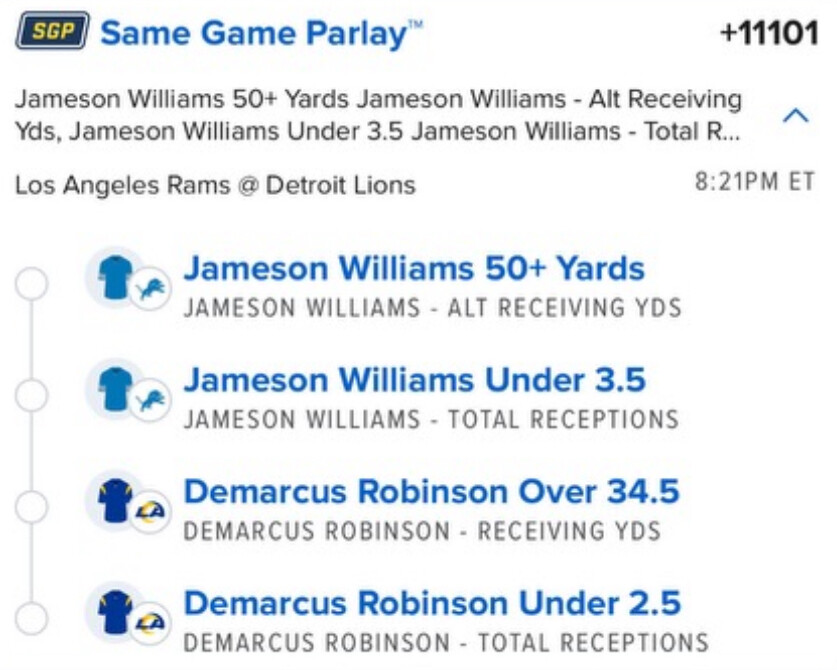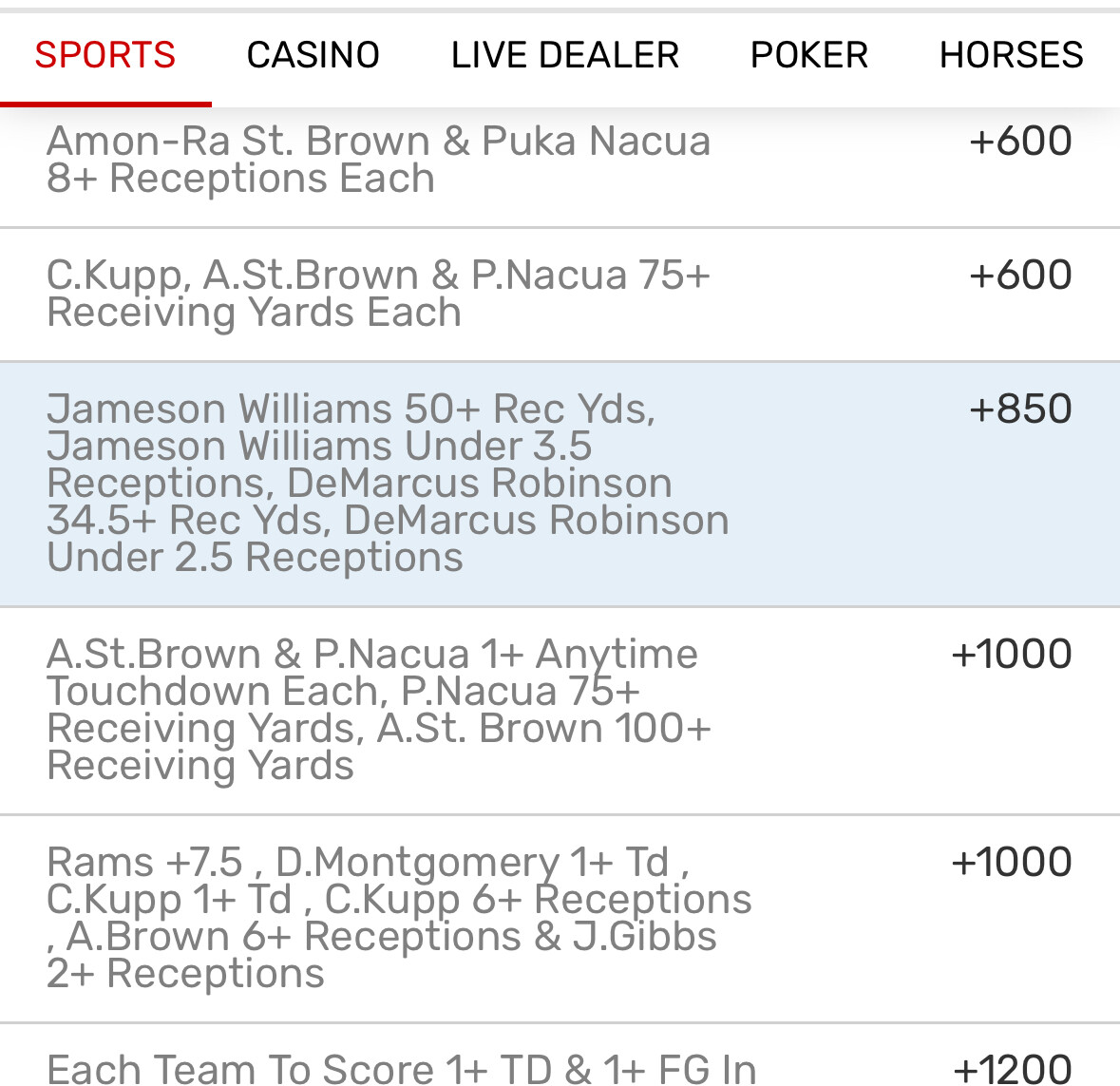 Can i get request prop total combined rushing yards for Rams vs Lions game?