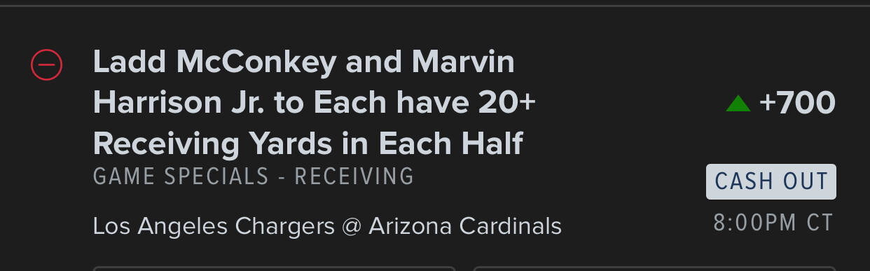 @moderators can you make a special for MNF? Lamar jackson over 10 pass yards each quarter, Baker Mayfield over 20 pass yards in each quarter. Derrick Henry over 10 rush yards in each quarter, JK dobbins over 10 rush yards in each quarter. All 4 teams to score over 10 points