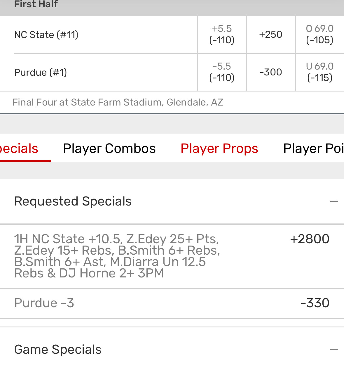 So to confirm, the exact same +2800 parlay as the picture indicates with one change. Removing DJ Horne 2+ 3PM and adding Fletcher Loyer o8.5 points