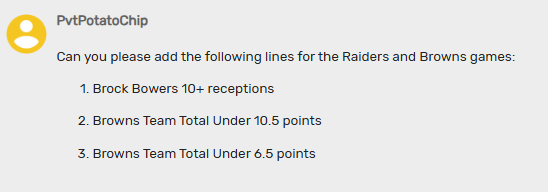 Normally, when we send over a request, it is added based on the information provided for the sport. If they don’t have sufficient details to create the line, they will try to source the information. If none is found, they won’t offer it. I will follow up again on your request