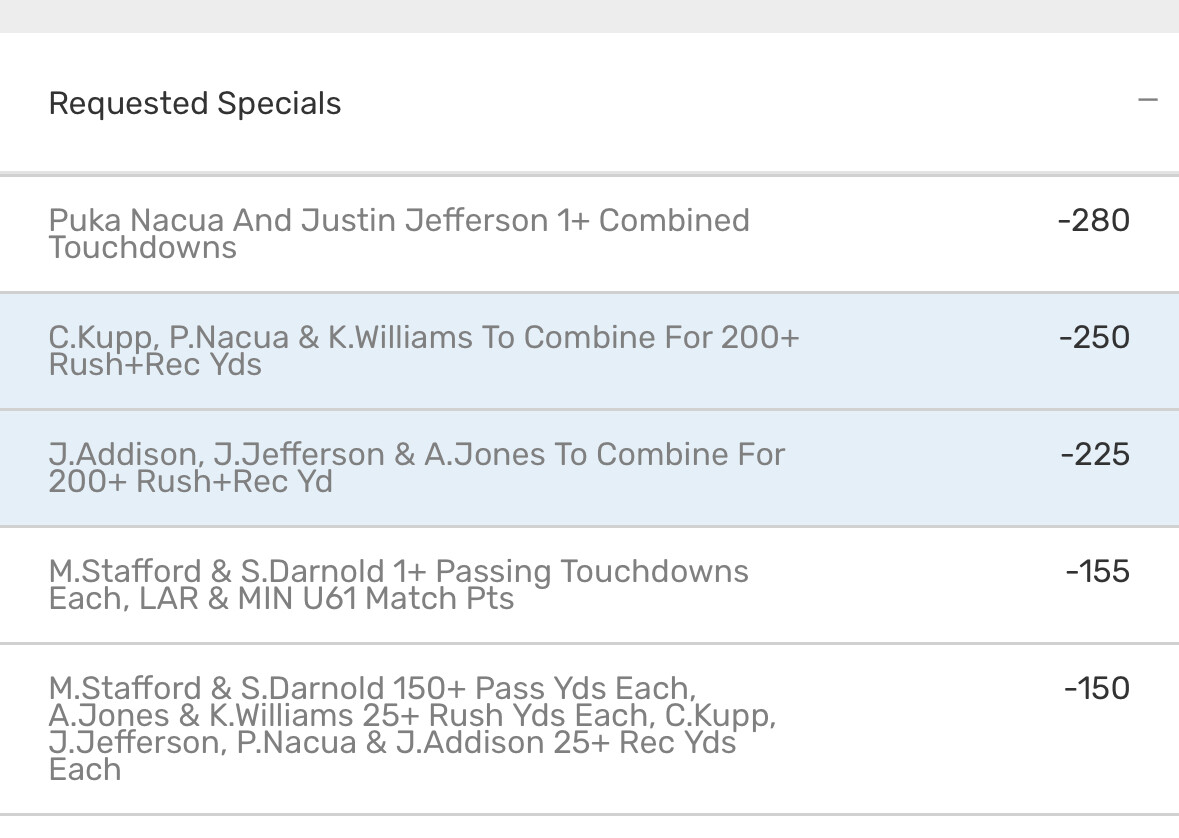 Can I please have the following parlay requested and added for the Vikings game tomorrow?