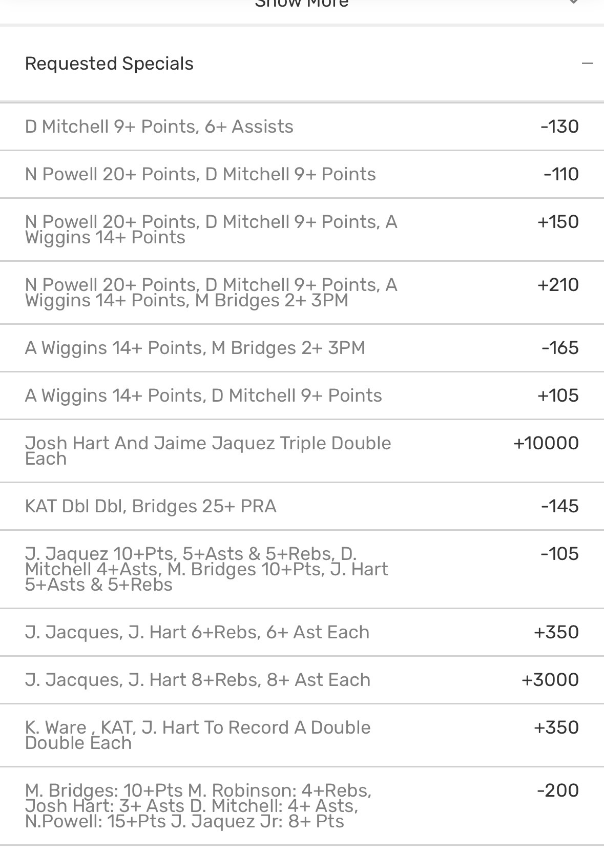 Can I request lamb 50 receiving , bowers 50 receiving, Pickens 25 receiving, dak 200, dak 1 passing TD, Btts 10+ and Jeanty 50 rushing yards