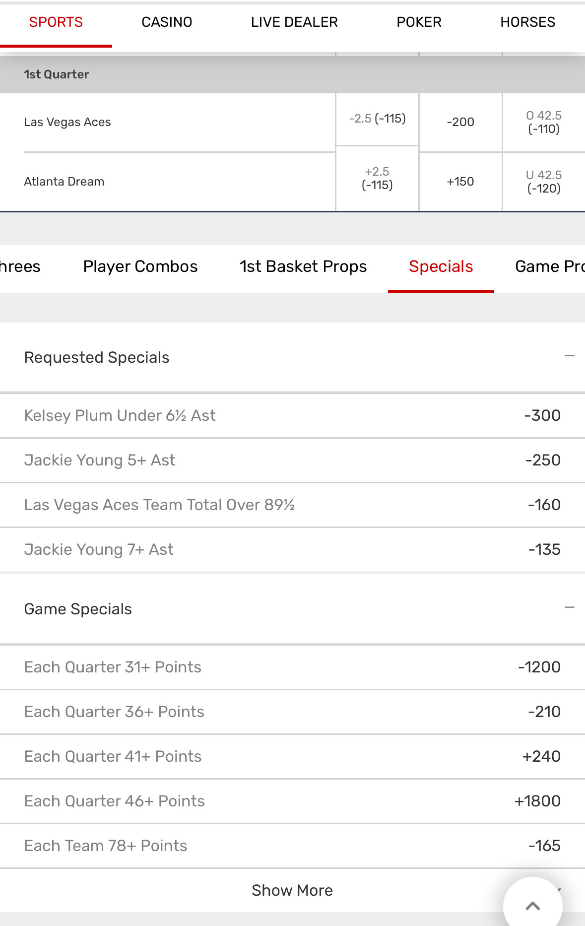 Check here. Some of the markets are available on their respective milestone, for example 25+ Pts A`ja Wilson, kelsepy plum 4+ Ast, and some are under the requested specials for the game.