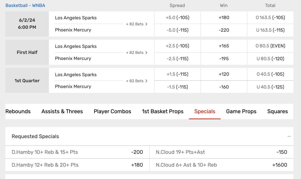 Los Angeles Sparks @ Phoenix Mercury 6:00 PM EST parlay