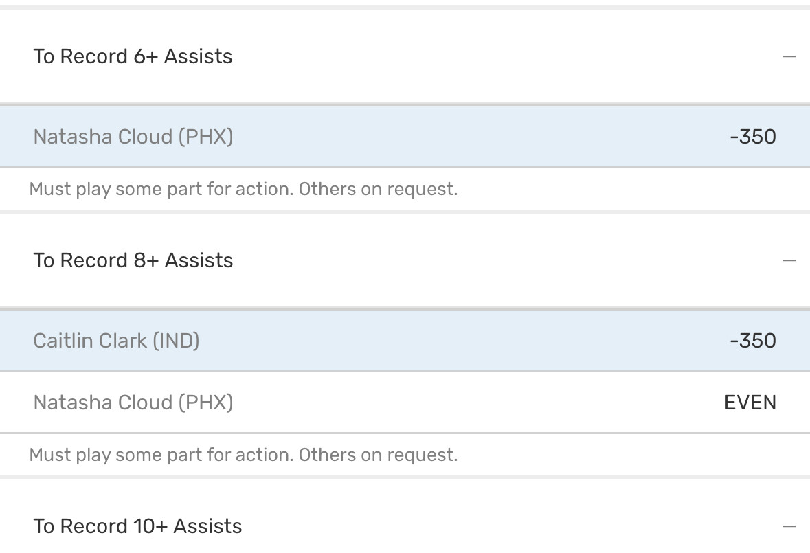Would you like the parlay to include Natasha Cloud to record 6+ assists and Caitlin Clark to record 8+ assists?