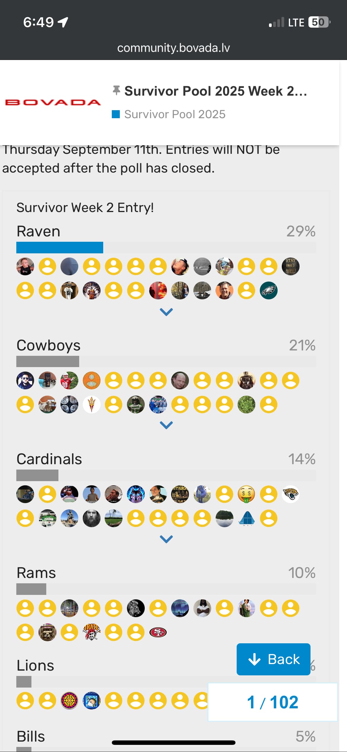 Someone in this thread complained (I think) that right after voting you could see how many voted for each team, and who they are. I think there are pros and cons to that, but really, so what? Itâs the same for everyone, so itâs a level playing field. Either none of us can see how everyone voted until itâs closed, or everyone can see. I donât see it as a big deal. Right now, with most of the field still alive, most of the votes are going to the biggest favorites, so itâs no surprise. I can see some gamesmanship being worthwhile later in the season if there are just a dozen left, but again, so what? Everyone is using the same ballot, so no one has an advantage.