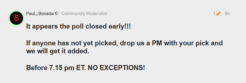 This poll has closed early, however we are still taking picks and adding them manually until the time the poll should have remained open until.