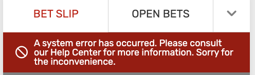 also seeing “A system error has occurred. Please consult our Help Center for more information. Sorry for the inconvenience.” when trying to place a bet
