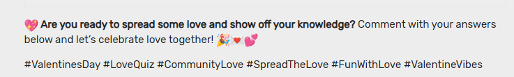 #ValentinesDay #LoveQuiz #CommunityLove #SpreadTheLove #FunWithLove #ValentineVibes