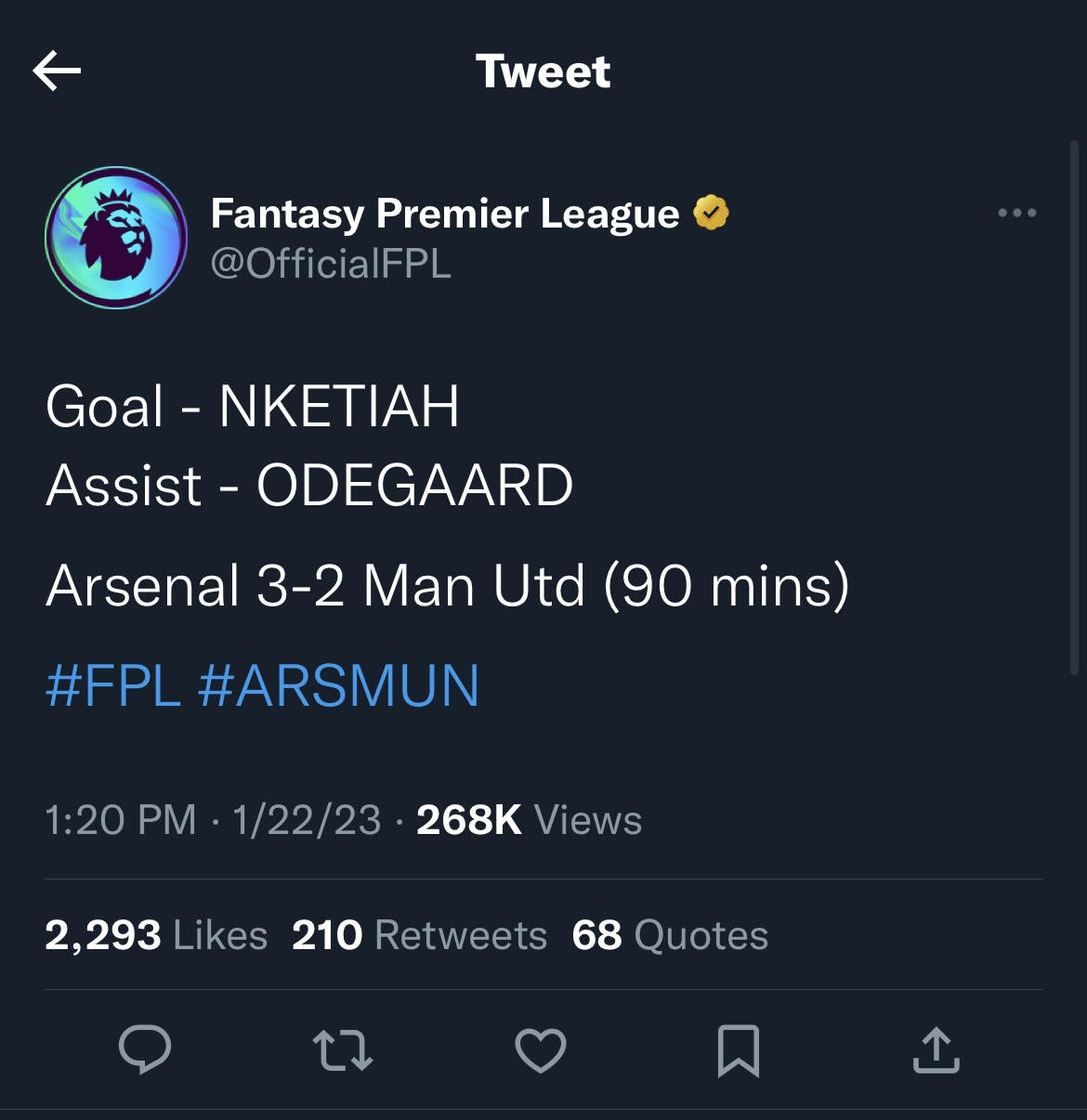 This is the article on ESPN.com and this is the official Premier League twitter confirming the assist. It was the last goal of the game where Martin Odegaard passed it to Nketiah to score. Please credit this correctly as other books are also crediting this correctly with him having one.