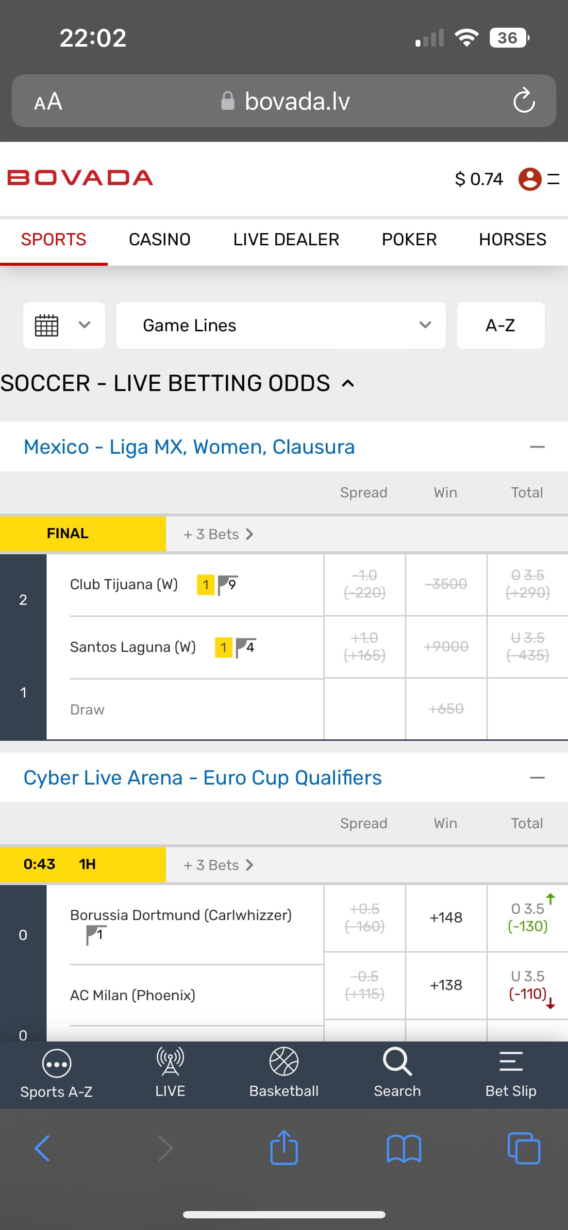 Hi tina I played a spread +1 twice santos laguna(w) and the scored ended 1-2 but the site called it a push. Thatâs def not a push. I had a recent game called a lost yesterday that shouldâve been a push. This is def wrong though. Ref. 23041718125455 And Ref. 23041718125225