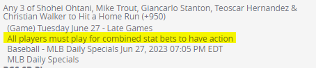 @Wdof81 in case of 23061764230496 I believe Mike Trout didnât participate thus the wager was settled as NO ACTION: