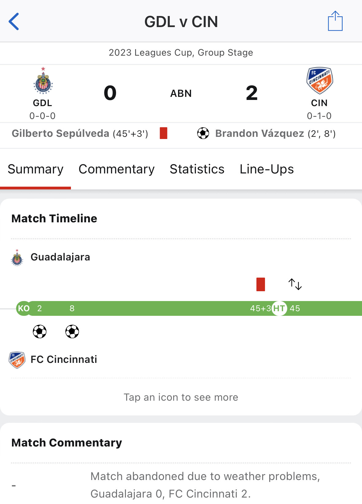 Cincinnati v Chivas game has been abandoned and is listed everywhere as ABN due to weather.