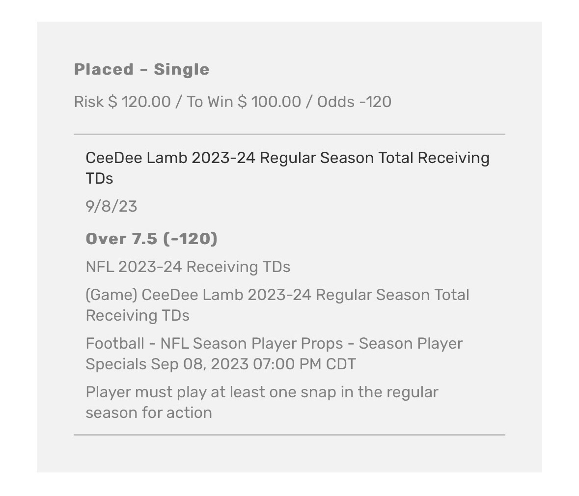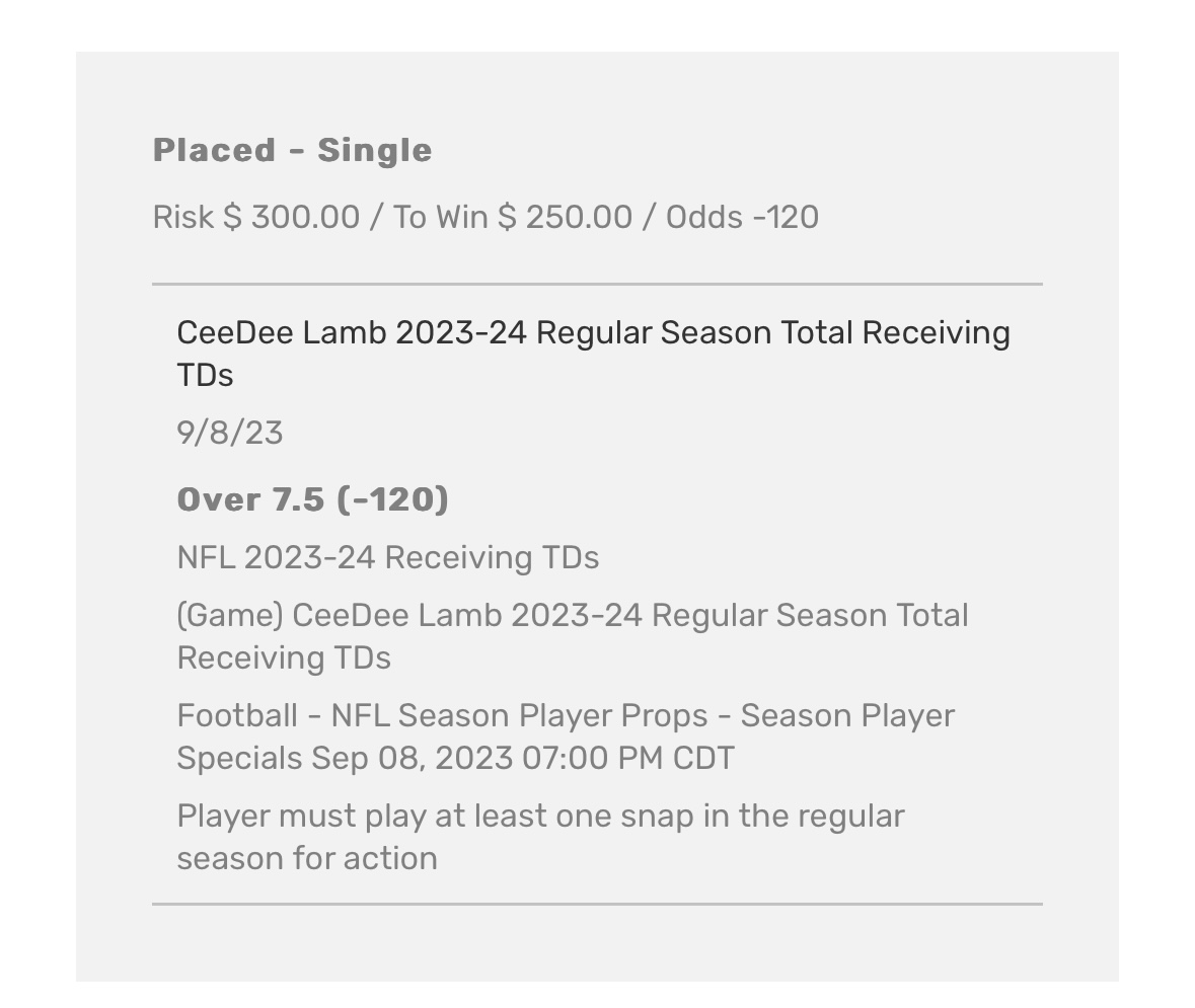 Please see my CeeDee Lamb wagers below. o7.5 receiving touchdowns.