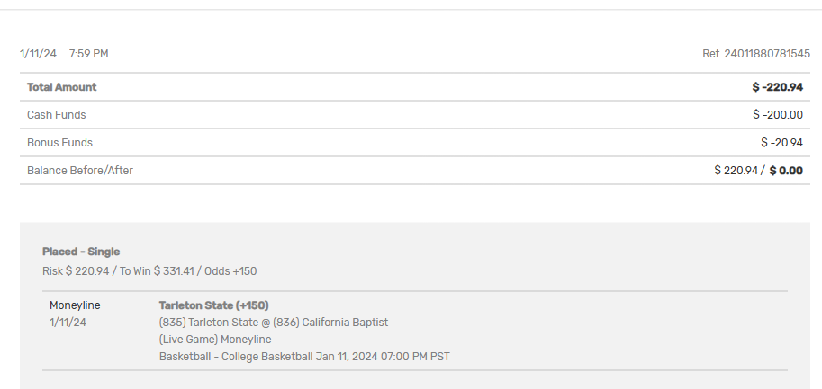As you can see here i made an issue by mistake and did 220.94 instead of 20.94 which was my bonus funds which is what I was trying to use. This was a bet on a mid major college basketball game I never go anything above 2 units on college basketball as you can see by my history. why are the customer service agents so confused by this. it was a clear mistake and I cant get an exception so everyone else can get one but me lol cmon.