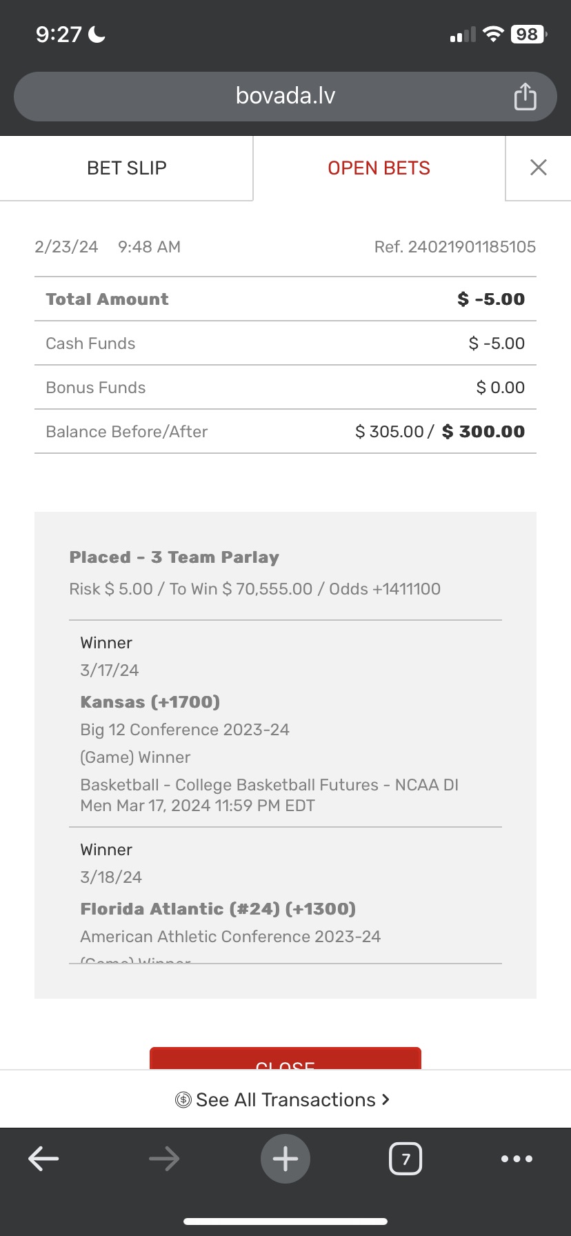 Hello @Paul_Bovada or @Mikey, I just wanted to ask for some help in resolving two unsettled bets on my account if possible. Ref. numbers 24031910347617 and 24031910347944. The initial amount before was $95 to $185 and second was $185 to $221. It finished around 11:30 am on March 11, E.T. however, several hours have gone by and nothings been changed so I just wanted to ask for some help with this. If you see this then thank you very much.