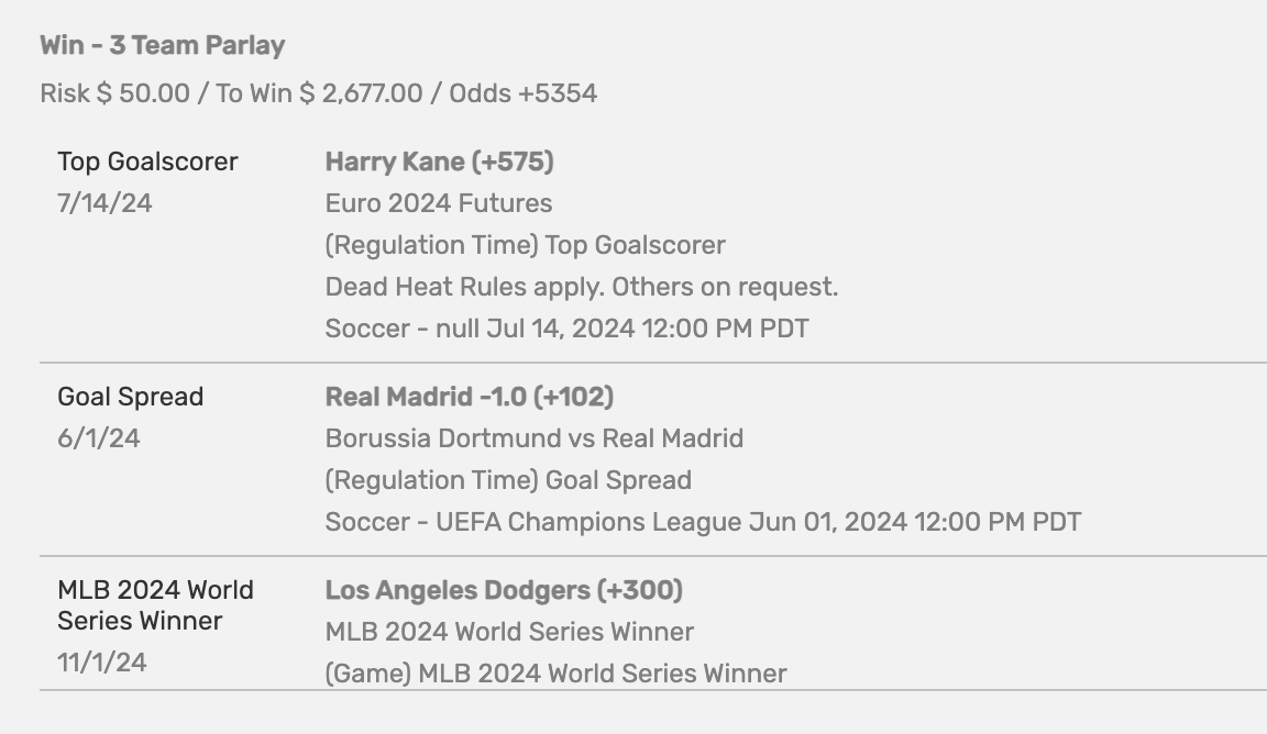 $50 parlay @ +98.53 odds, +102 odds and +300 odds = $752.06