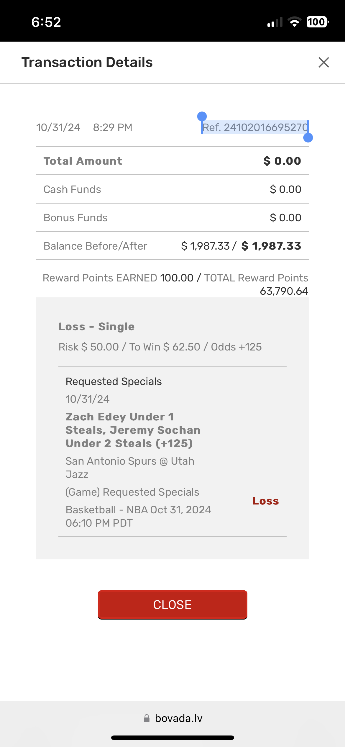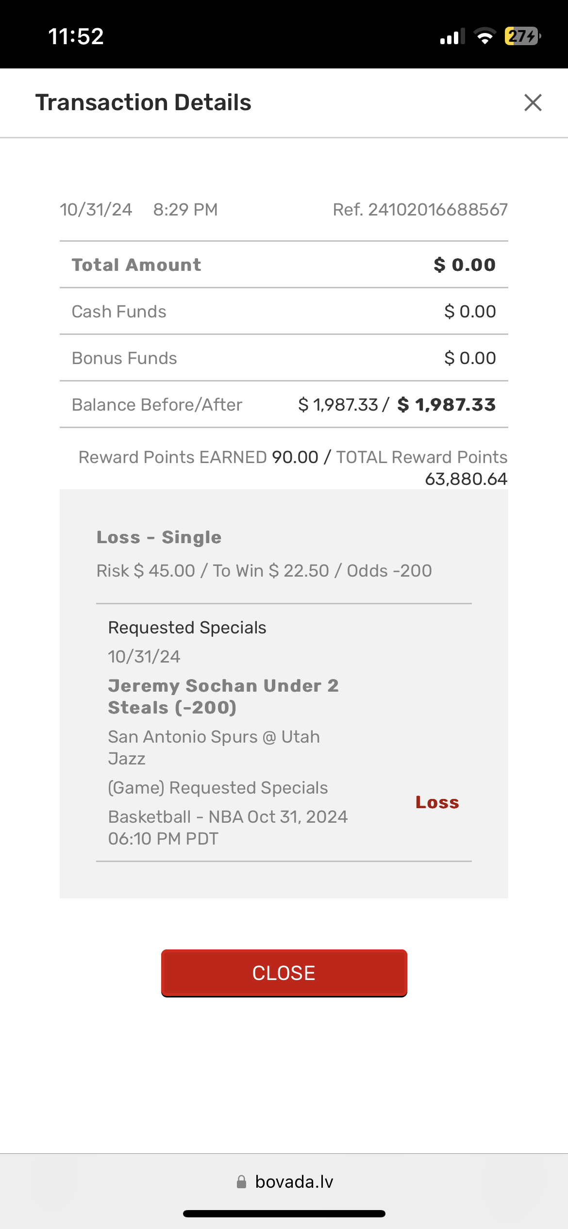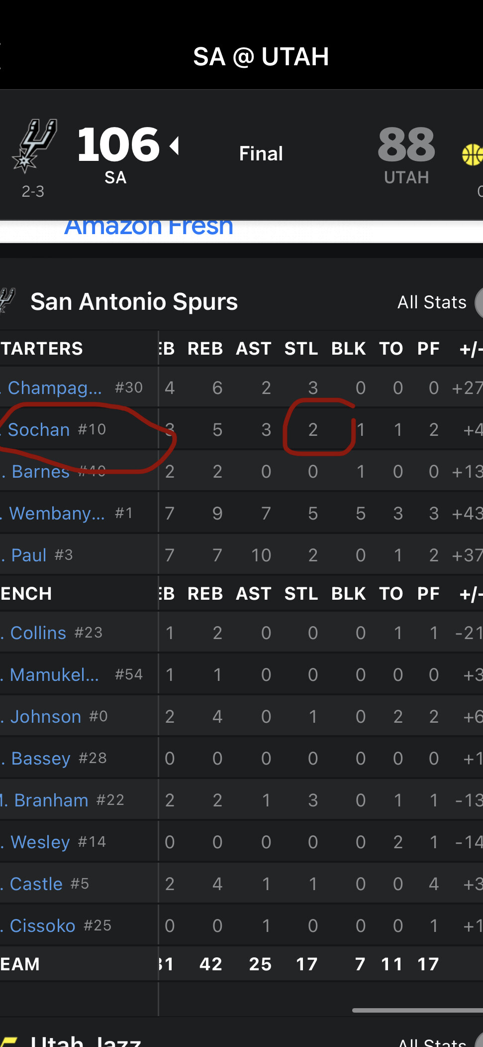 Jeremy Sochan finished with 2 steals and the line was listed as “2” and not “1.5”. Please see the attached picture.