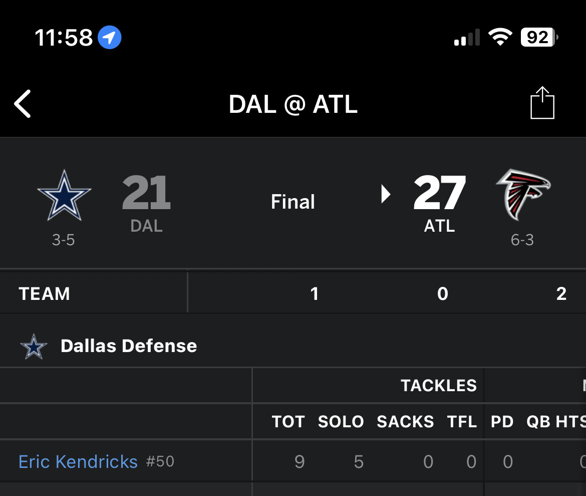 I am attaching a photo from ESPN showing Eric Kendricks finished with 9 total tackles + assists.